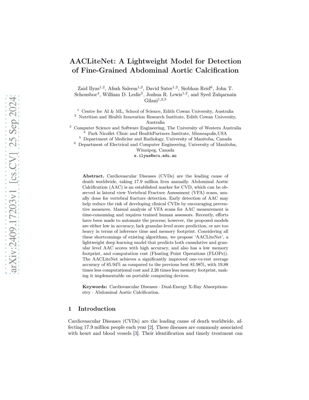 Cardiovascular Diseases (CVDs) are the leading cause of death worldwide, taking 17.9 million lives annually. Abdominal Aortic Calcification (AAC) is an established marker for CVD, which can be observed in lateral view Vertebral Fracture Assessment (VFA) scans, usually done for vertebral fracture detection. Early detection of AAC may help reduce the risk of developing clinical CVDs by encouraging preventive measures. Manual analysis of VFA scans for AAC measurement is time consuming and requires trained human assessors. Recently, efforts have been made to automate the process, however, the proposed models are either low in accuracy, lack granular level score prediction, or are too heavy in terms of inference time and memory footprint. Considering all these shortcomings of existing algorithms, we propose ÁACLiteNet', a lightweight deep learning model that predicts both cumulative and granular level AAC scores with high accuracy, and also has a low memory footprint, and computation cost (Floating Point Operations (FLOPs)). The AACLiteNet achieves a significantly improved one-vs-rest average accuracy of 85.94% as compared to the previous best 81.98%, with 19.88 times less computational cost and 2.26 times less memory footprint, making it implementable on portable computing devices.