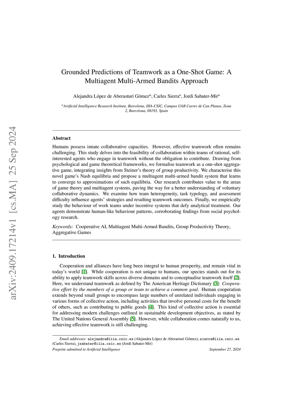 Humans possess innate collaborative capacities. However, effective teamwork often remains challenging. This study delves into the feasibility of collaboration within teams of rational, self-interested agents who engage in teamwork without the obligation to contribute. Drawing from psychological and game theoretical frameworks, we formalise teamwork as a one-shot aggregative game, integrating insights from Steiner's theory of group productivity. We characterise this novel game's Nash equilibria and propose a multiagent multi-armed bandit system that learns to converge to approximations of such equilibria. Our research contributes value to the areas of game theory and multiagent systems, paving the way for a better understanding of voluntary collaborative dynamics. We examine how team heterogeneity, task typology, and assessment difficulty influence agents' strategies and resulting teamwork outcomes. Finally, we empirically study the behaviour of work teams under incentive systems that defy analytical treatment. Our agents demonstrate human-like behaviour patterns, corroborating findings from social psychology research.