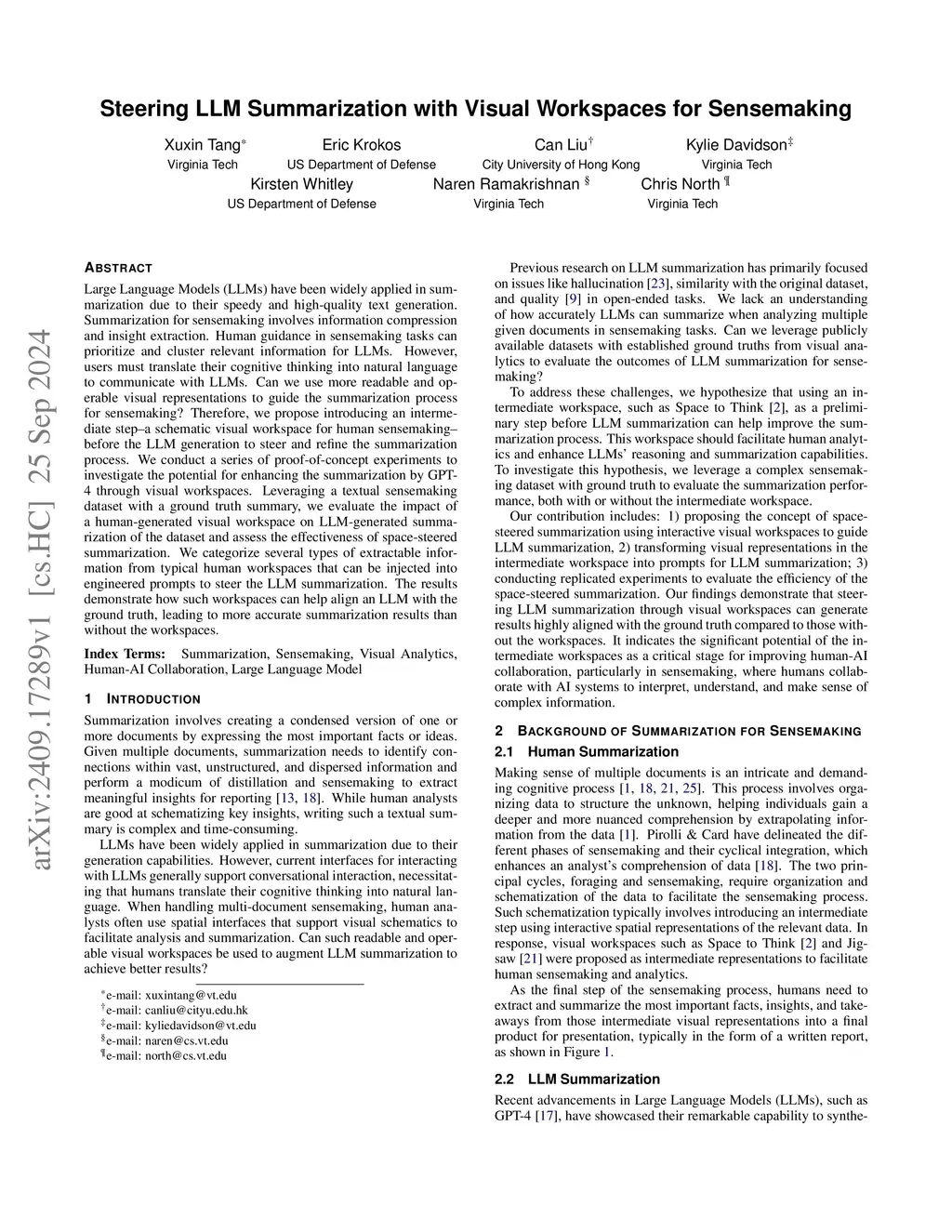 Steering LLM Summarization with Visual Workspaces for Sensemaking