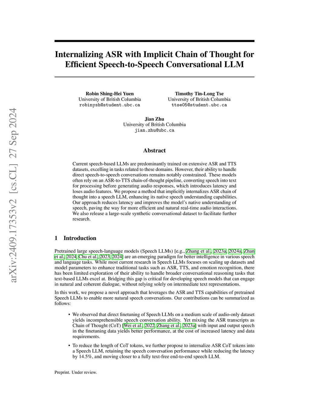 Current speech-based LLMs are predominantly trained on extensive ASR and TTS datasets, excelling in tasks related to these domains. However, their ability to handle direct speech-to-speech conversations remains notably constrained. These models often rely on an ASR-to-TTS chain-of-thought pipeline, converting speech into text for processing before generating audio responses, which introduces latency and loses audio features. We propose a method that implicitly internalizes ASR chain of thought into a speech LLM, enhancing its native speech understanding capabilities. Our approach reduces latency and improves the model's native understanding of speech, paving the way for more efficient and natural real-time audio interactions. We also release a large-scale synthetic conversational dataset to facilitate further research.