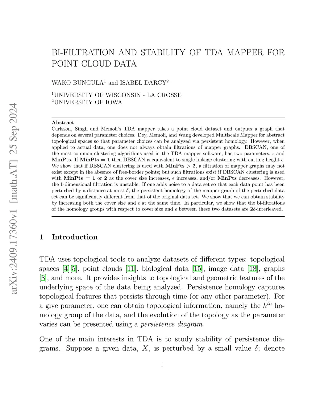 Carlsson, Singh and Memoli's TDA mapper takes a point cloud dataset and outputs a graph that depends on several parameter choices. Dey, Memoli, and Wang developed Multiscale Mapper for abstract topological spaces so that parameter choices can be analyzed via persistent homology. However, when applied to actual data, one does not always obtain filtrations of mapper graphs. DBSCAN, one of the most common clustering algorithms used in the TDA mapper software, has two parameters, \textbf{} and \textbf{MinPts}. If \textbf{MinPts = 1} then DBSCAN is equivalent to single linkage clustering with cutting height \textbf{}. We show that if DBSCAN clustering is used with \textbf{MinPts 2}, a filtration of mapper graphs may not exist except in the absence of free-border points; but such filtrations exist if DBSCAN clustering is used with \textbf{MinPts = 1} or \textbf{2} as the cover size increases, \textbf{} increases, and/or \textbf{MinPts} decreases. However, the 1-dimensional filtration is unstable. If one adds noise to a data set so that each data point has been perturbed by a distance at most \textbf{}, the persistent homology of the mapper graph of the perturbed data set can be significantly different from that of the original data set. We show that we can obtain stability by increasing both the cover size and \textbf{} at the same time. In particular, we show that the bi-filtrations of the homology groups with respect to cover size and between these two datasets are \textbf{2}-interleaved.