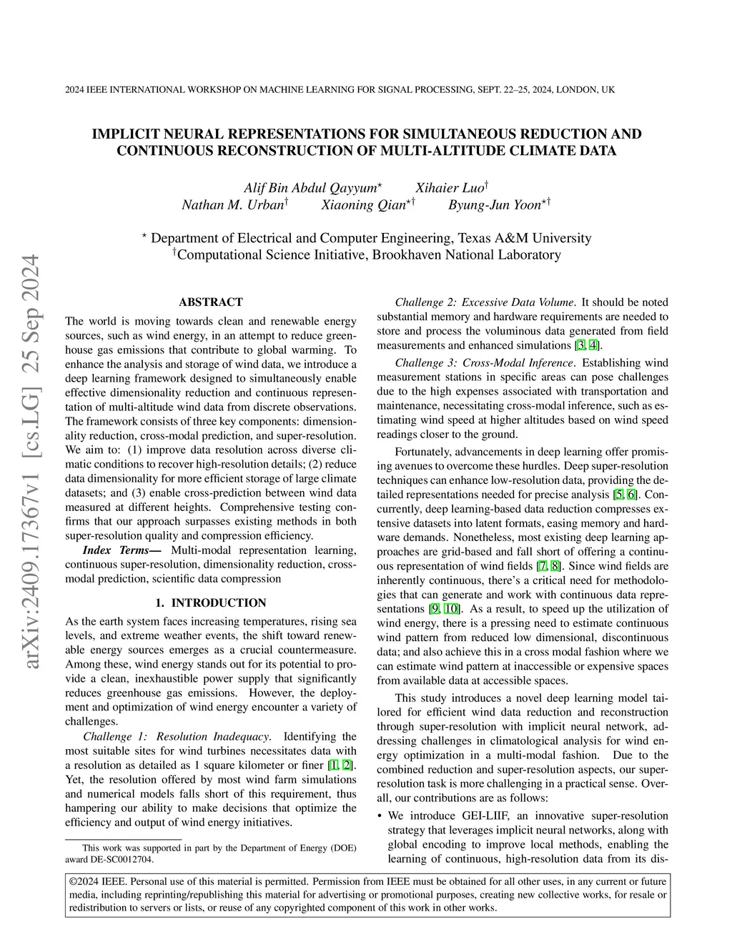 The world is moving towards clean and renewable energy sources, such as wind energy, in an attempt to reduce greenhouse gas emissions that contribute to global warming. To enhance the analysis and storage of wind data, we introduce a deep learning framework designed to simultaneously enable effective dimensionality reduction and continuous representation of multi-altitude wind data from discrete observations. The framework consists of three key components: dimensionality reduction, cross-modal prediction, and super-resolution. We aim to: (1) improve data resolution across diverse climatic conditions to recover high-resolution details; (2) reduce data dimensionality for more efficient storage of large climate datasets; and (3) enable cross-prediction between wind data measured at different heights. Comprehensive testing confirms that our approach surpasses existing methods in both super-resolution quality and compression efficiency.