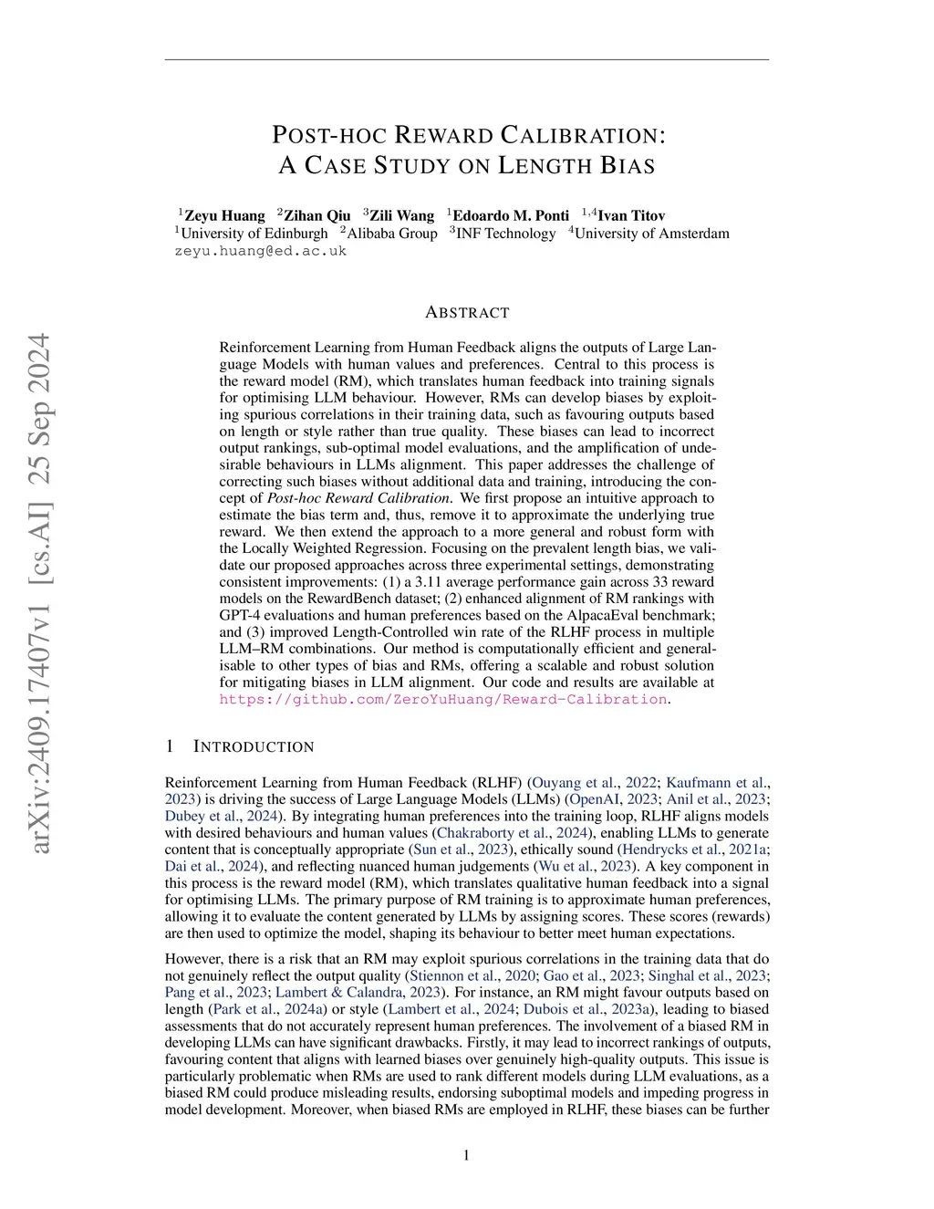 Reinforcement Learning from Human Feedback aligns the outputs of Large Language Models with human values and preferences. Central to this process is the reward model (RM), which translates human feedback into training signals for optimising LLM behaviour. However, RMs can develop biases by exploiting spurious correlations in their training data, such as favouring outputs based on length or style rather than true quality. These biases can lead to incorrect output rankings, sub-optimal model evaluations, and the amplification of undesirable behaviours in LLMs alignment. This paper addresses the challenge of correcting such biases without additional data and training, introducing the concept of Post-hoc Reward Calibration. We first propose an intuitive approach to estimate the bias term and, thus, remove it to approximate the underlying true reward. We then extend the approach to a more general and robust form with the Locally Weighted Regression. Focusing on the prevalent length bias, we validate our proposed approaches across three experimental settings, demonstrating consistent improvements: (1) a 3.11 average performance gain across 33 reward models on the RewardBench dataset; (2) enhanced alignment of RM rankings with GPT-4 evaluations and human preferences based on the AlpacaEval benchmark; and (3) improved Length-Controlled win rate of the RLHF process in multiple LLM--RM combinations. Our method is computationally efficient and generalisable to other types of bias and RMs, offering a scalable and robust solution for mitigating biases in LLM alignment. Our code and results are available atthis https URL.