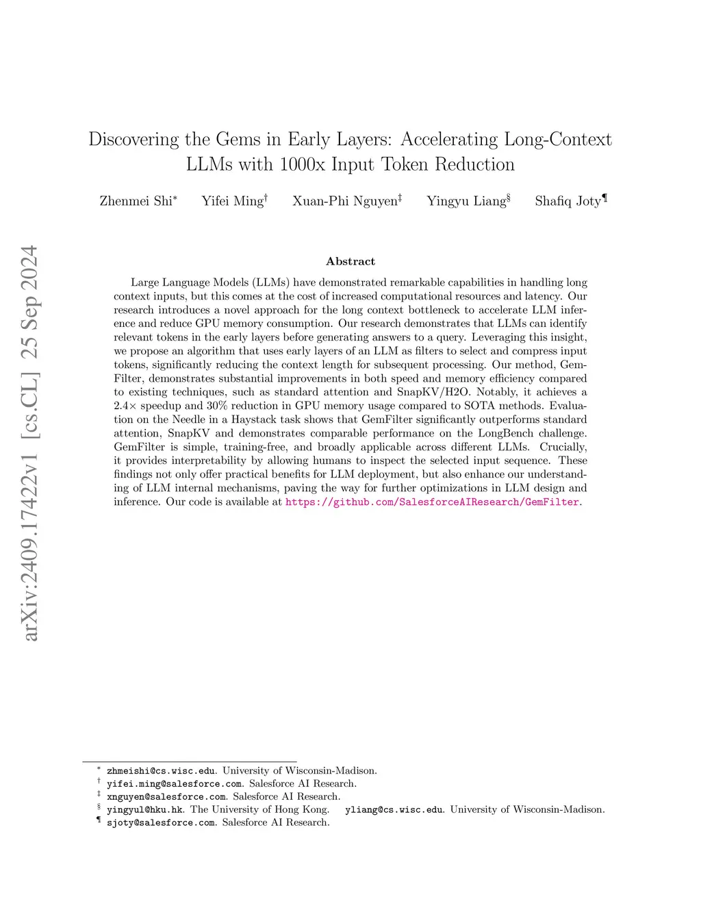 Large Language Models (LLMs) have demonstrated remarkable capabilities in handling long context inputs, but this comes at the cost of increased computational resources and latency. Our research introduces a novel approach for the long context bottleneck to accelerate LLM inference and reduce GPU memory consumption. Our research demonstrates that LLMs can identify relevant tokens in the early layers before generating answers to a query. Leveraging this insight, we propose an algorithm that uses early layers of an LLM as filters to select and compress input tokens, significantly reducing the context length for subsequent processing. Our method, GemFilter, demonstrates substantial improvements in both speed and memory efficiency compared to existing techniques, such as standard attention and SnapKV/H2O. Notably, it achieves a 2.4 speedup and 30\% reduction in GPU memory usage compared to SOTA methods. Evaluation on the Needle in a Haystack task shows that GemFilter significantly outperforms standard attention, SnapKV and demonstrates comparable performance on the LongBench challenge. GemFilter is simple, training-free, and broadly applicable across different LLMs. Crucially, it provides interpretability by allowing humans to inspect the selected input sequence. These findings not only offer practical benefits for LLM deployment, but also enhance our understanding of LLM internal mechanisms, paving the way for further optimizations in LLM design and inference. Our code is available at \url{https://github.com/SalesforceAIResearch/GemFilter}.