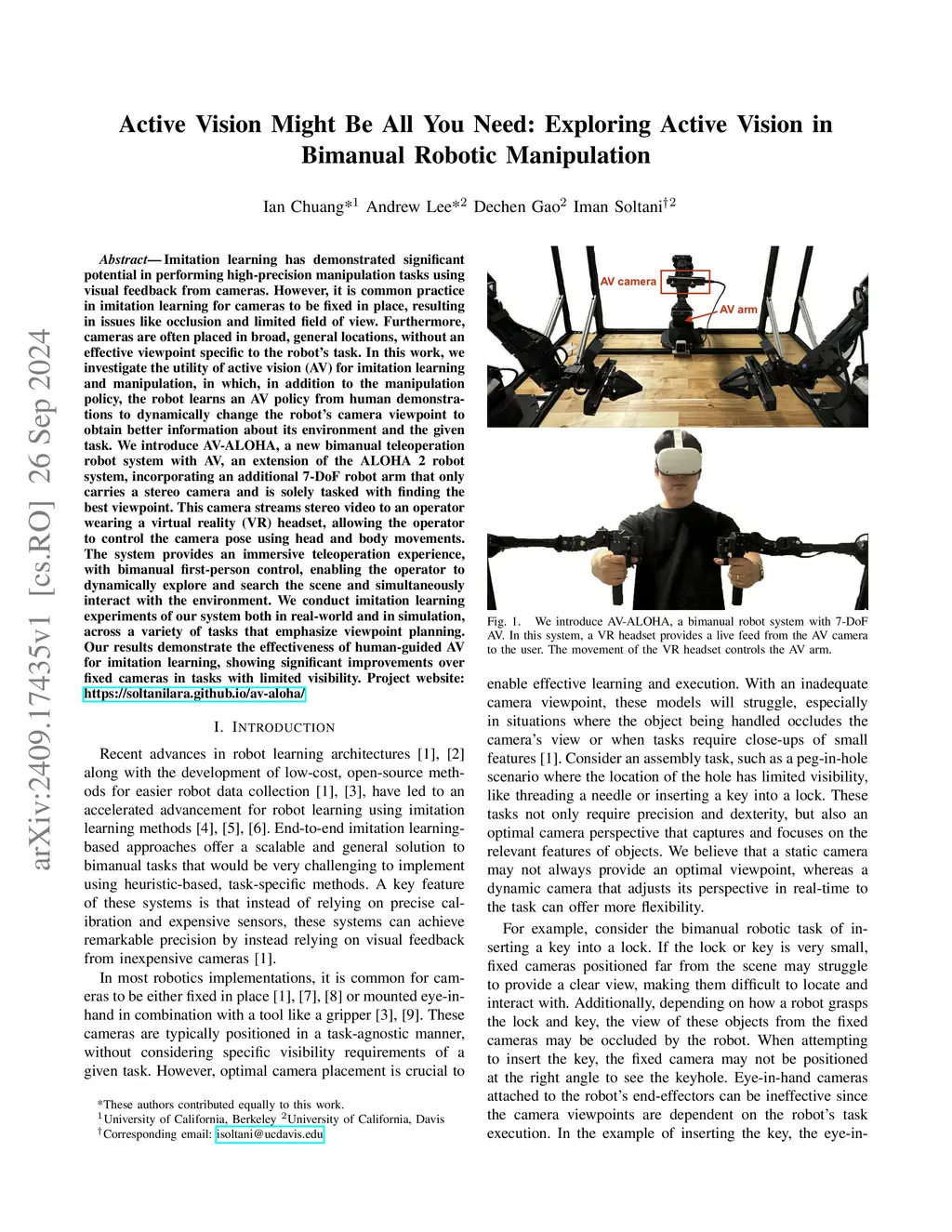 Imitation learning has demonstrated significant potential in performing high-precision manipulation tasks using visual feedback. However, it is common practice in imitation learning for cameras to be fixed in place, resulting in issues like occlusion and limited field of view. Furthermore, cameras are often placed in broad, general locations, without an effective viewpoint specific to the robot's task. In this work, we investigate the utility of active vision (AV) for imitation learning and manipulation, in which, in addition to the manipulation policy, the robot learns an AV policy from human demonstrations to dynamically change the robot's camera viewpoint to obtain better information about its environment and the given task. We introduce AV-ALOHA, a new bimanual teleoperation robot system with AV, an extension of the ALOHA 2 robot system, incorporating an additional 7-DoF robot arm that only carries a stereo camera and is solely tasked with finding the best viewpoint. This camera streams stereo video to an operator wearing a virtual reality (VR) headset, allowing the operator to control the camera pose using head and body movements. The system provides an immersive teleoperation experience, with bimanual first-person control, enabling the operator to dynamically explore and search the scene and simultaneously interact with the environment. We conduct imitation learning experiments of our system both in real-world and in simulation, across a variety of tasks that emphasize viewpoint planning. Our results demonstrate the effectiveness of human-guided AV for imitation learning, showing significant improvements over fixed cameras in tasks with limited visibility. Project website:this https URL