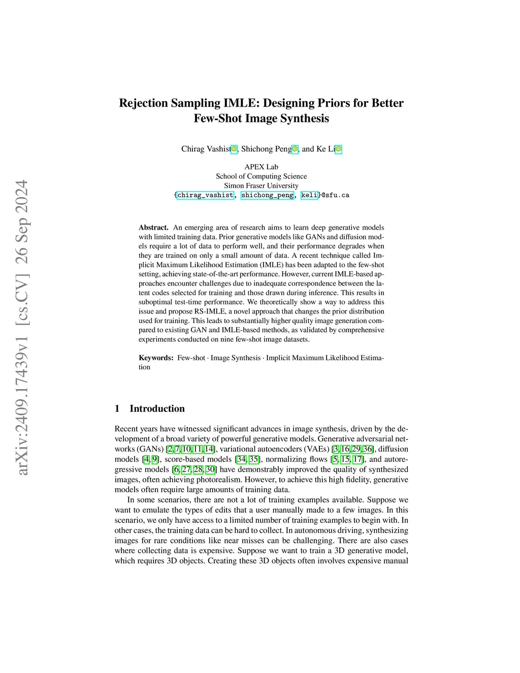 An emerging area of research aims to learn deep generative models with limited training data. Prior generative models like GANs and diffusion models require a lot of data to perform well, and their performance degrades when they are trained on only a small amount of data. A recent technique called Implicit Maximum Likelihood Estimation (IMLE) has been adapted to the few-shot setting, achieving state-of-the-art performance. However, current IMLE-based approaches encounter challenges due to inadequate correspondence between the latent codes selected for training and those drawn during inference. This results in suboptimal test-time performance. We theoretically show a way to address this issue and propose RS-IMLE, a novel approach that changes the prior distribution used for training. This leads to substantially higher quality image generation compared to existing GAN and IMLE-based methods, as validated by comprehensive experiments conducted on nine few-shot image datasets.
