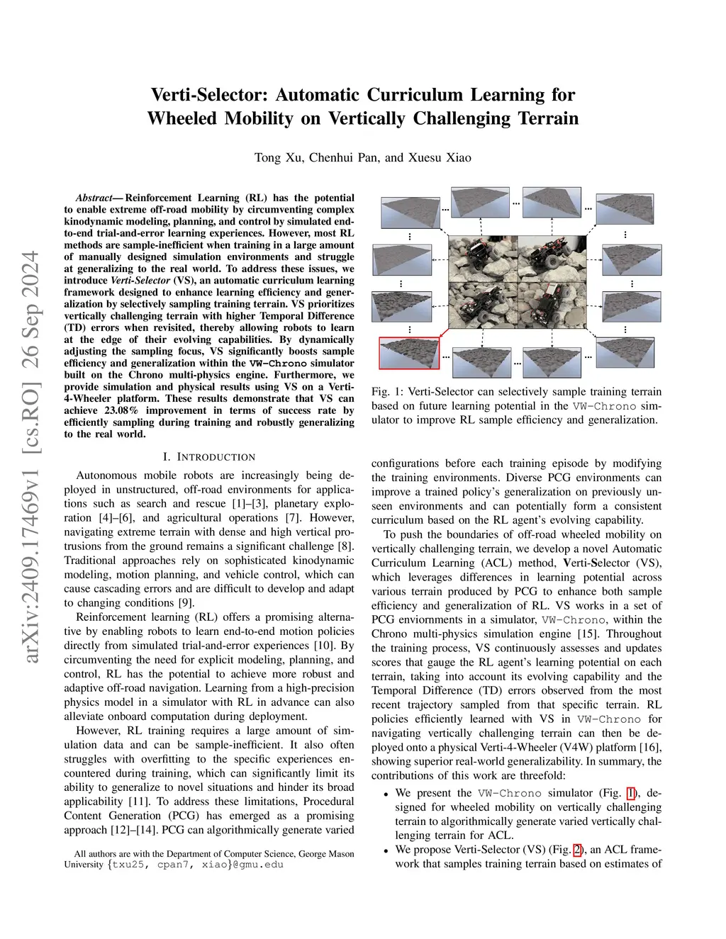 Reinforcement Learning (RL) has the potential to enable extreme off-road mobility by circumventing complex kinodynamic modeling, planning, and control by simulated end-to-end trial-and-error learning experiences. However, most RL methods are sample-inefficient when training in a large amount of manually designed simulation environments and struggle at generalizing to the real world. To address these issues, we introduce VertiSelector (VS), an automatic curriculum learning framework designed to enhance learning efficiency and generalization by selectively sampling training terrain. VS prioritizes vertically challenging terrain with higher Temporal Difference (TD) errors when revisited, thereby allowing robots to learn at the edge of their evolving capabilities. By dynamically adjusting the sampling focus, VS significantly boosts sample efficiency and generalization within the VW-Chrono simulator built on the Chrono multi-physics engine. Furthermore, we provide simulation and physical results using VS on a Verti-4-Wheeler platform. These results demonstrate that VS can achieve 23.08% improvement in terms of success rate by efficiently sampling during training and robustly generalizing to the real world.