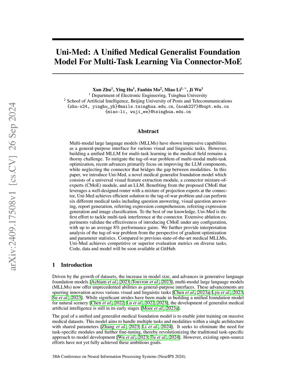 Multi-modal large language models (MLLMs) have shown impressive capabilities as a general-purpose interface for various visual and linguistic tasks. However, building a unified MLLM for multi-task learning in the medical field remains a thorny challenge. To mitigate the tug-of-war problem of multi-modal multi-task optimization, recent advances primarily focus on improving the LLM components, while neglecting the connector that bridges the gap between modalities. In this paper, we introduce Uni-Med, a novel medical generalist foundation model which consists of a universal visual feature extraction module, a connector mixture-of-experts (CMoE) module, and an LLM. Benefiting from the proposed CMoE that leverages a well-designed router with a mixture of projection experts at the connector, Uni-Med achieves efficient solution to the tug-of-war problem and can perform six different medical tasks including question answering, visual question answering, report generation, referring expression comprehension, referring expression generation and image classification. To the best of our knowledge, Uni-Med is the first effort to tackle multi-task interference at the connector. Extensive ablation experiments validate the effectiveness of introducing CMoE under any configuration, with up to an average 8% performance gains. We further provide interpretation analysis of the tug-of-war problem from the perspective of gradient optimization and parameter statistics. Compared to previous state-of-the-art medical MLLMs, Uni-Med achieves competitive or superior evaluation metrics on diverse tasks. Code, data and model will be soon available at GitHub.