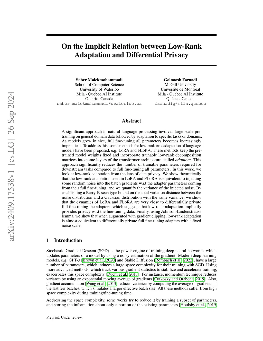 A significant approach in natural language processing involves large-scale pre-training of models on general domain data followed by their adaptation to specific tasks or domains. As models grow in size, full fine-tuning all of their parameters becomes increasingly impractical. To address this, some methods for low-rank task adaptation of language models have been proposed, e.g., LoRA and FLoRA. These methods keep the pre-trained model weights fixed and incorporate trainable low-rank decomposition matrices into some layers of the transformer architecture, called adapters. This approach significantly reduces the number of trainable parameters required for downstream tasks compared to full fine-tuning all parameters. In this work, we look at low-rank adaptation from the lens of data privacy. We show theoretically that the low-rank adaptation used in LoRA and FLoRA leads to the injection of some random noise into the batch gradients w.r.t the adapter parameters. We quantify the variance of the injected noise and show that the smaller the adaptation rank, the larger the noise variance. By establishing a Berry-Esseen type bound on the total variation distance between distribution of the injected noise and a Gaussian distribution with the same variance, we show that the dynamics of low-rank adaptation is close to that of differentially private fine-tuning of the adapters. Finally, using Johnson-Lindenstrauss lemma, we show that when augmented with gradient scaling, low-rank adaptation is very close to performing DPSGD algorithm with a fixed noise scale to fine-tune the adapters. Suggested by our theoretical findings and approved by our experimental results, we show that low-rank adaptation, besides mitigating the space and computational complexities, implicitly provides a privacy protection w.r.t the fine-tuning data, without inducing the high space complexity of DPSGD.