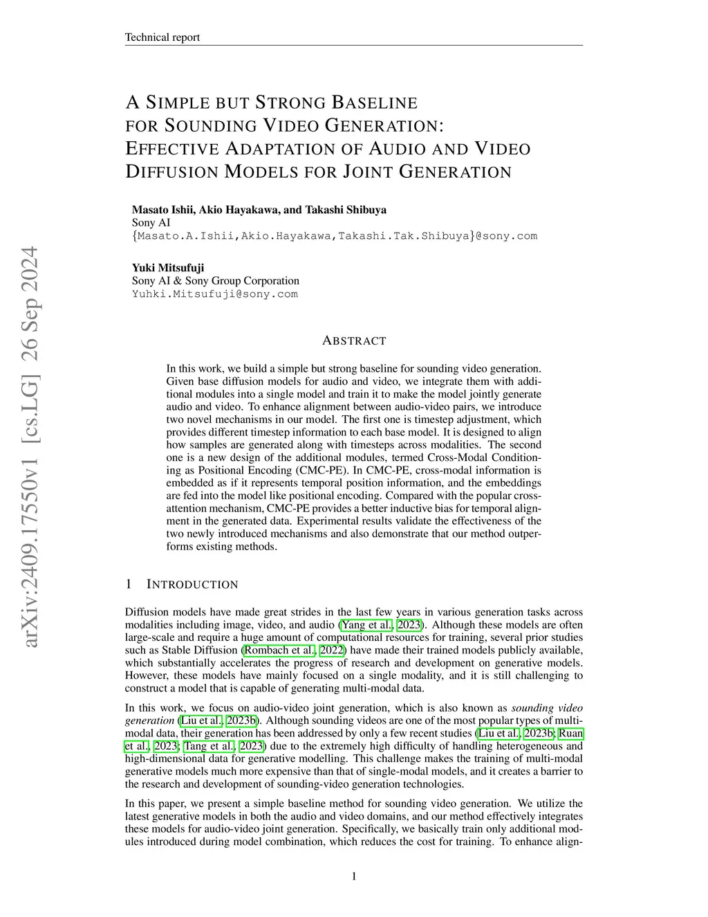 In this work, we build a simple but strong baseline for sounding video generation. Given base diffusion models for audio and video, we integrate them with additional modules into a single model and train it to make the model jointly generate audio and video. To enhance alignment between audio-video pairs, we introduce two novel mechanisms in our model. The first one is timestep adjustment, which provides different timestep information to each base model. It is designed to align how samples are generated along with timesteps across modalities. The second one is a new design of the additional modules, termed Cross-Modal Conditioning as Positional Encoding (CMC-PE). In CMC-PE, cross-modal information is embedded as if it represents temporal position information, and the embeddings are fed into the model like positional encoding. Compared with the popular cross-attention mechanism, CMC-PE provides a better inductive bias for temporal alignment in the generated data. Experimental results validate the effectiveness of the two newly introduced mechanisms and also demonstrate that our method outperforms existing methods.