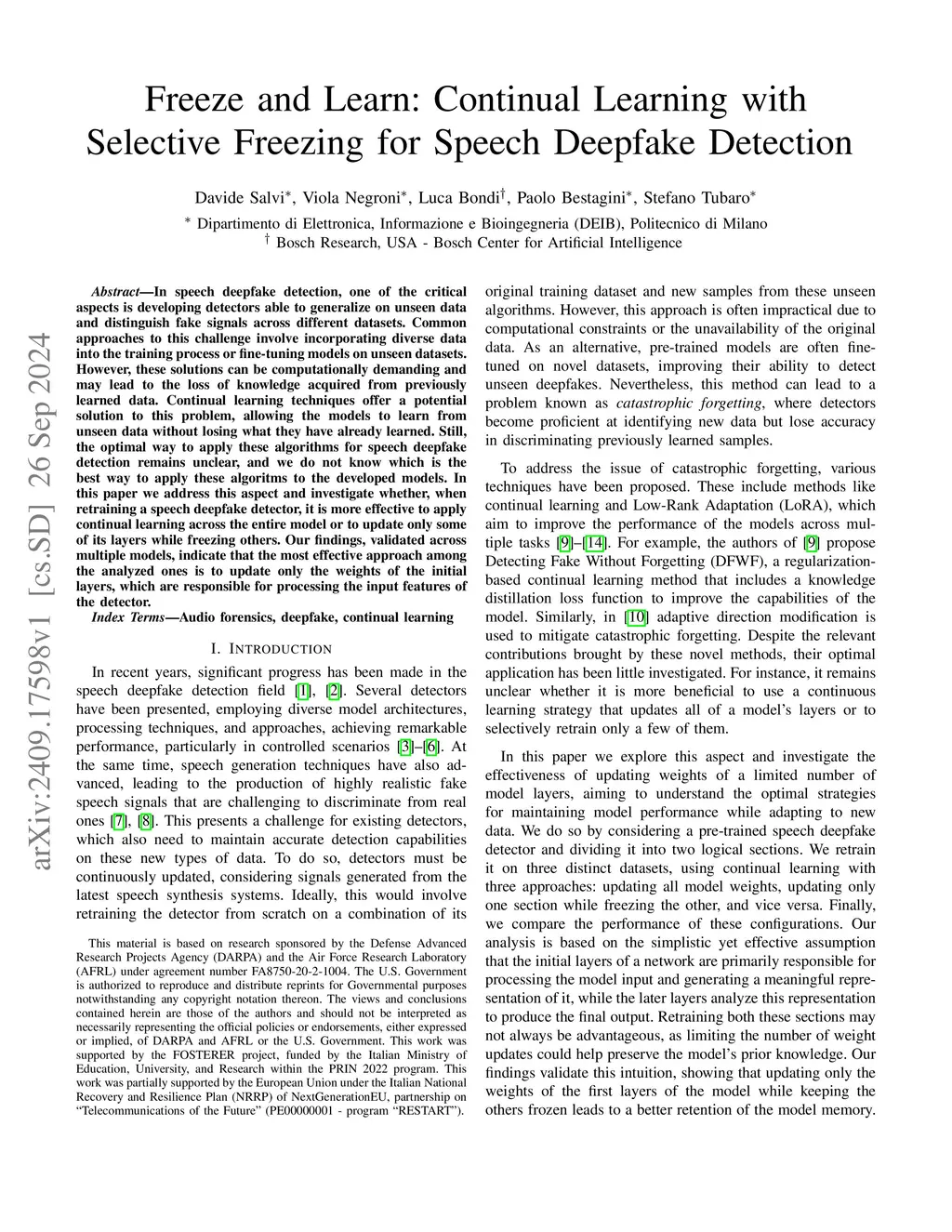 In speech deepfake detection, one of the critical aspects is developing detectors able to generalize on unseen data and distinguish fake signals across different datasets. Common approaches to this challenge involve incorporating diverse data into the training process or fine-tuning models on unseen datasets. However, these solutions can be computationally demanding and may lead to the loss of knowledge acquired from previously learned data. Continual learning techniques offer a potential solution to this problem, allowing the models to learn from unseen data without losing what they have already learned. Still, the optimal way to apply these algorithms for speech deepfake detection remains unclear, and we do not know which is the best way to apply these algorithms to the developed models. In this paper we address this aspect and investigate whether, when retraining a speech deepfake detector, it is more effective to apply continual learning across the entire model or to update only some of its layers while freezing others. Our findings, validated across multiple models, indicate that the most effective approach among the analyzed ones is to update only the weights of the initial layers, which are responsible for processing the input features of the detector.