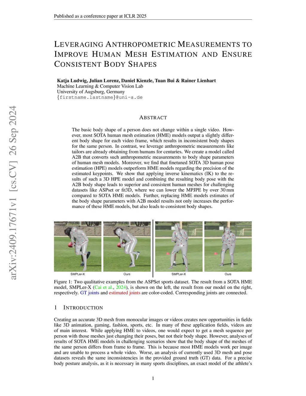 The basic body shape (i.e., the body shape in T-pose) of a person does not change within a single video. However, most SOTA human mesh estimation (HME) models output a slightly different, thus inconsistent basic body shape for each video frame. Furthermore, we find that SOTA 3D human pose estimation (HPE) models outperform HME models regarding the precision of the estimated 3D keypoint positions. We solve the problem of inconsistent body shapes by leveraging anthropometric measurements like taken by tailors from humans. We create a model called A2B that converts given anthropometric measurements to basic body shape parameters of human mesh models. We obtain superior and consistent human meshes by combining the A2B model results with the keypoints of 3D HPE models using inverse kinematics. We evaluate our approach on challenging datasets like ASPset or fit3D, where we can lower the MPJPE by over 30 mm compared to SOTA HME models. Further, replacing estimates of the body shape parameters from existing HME models with A2B results not only increases the performance of these HME models, but also guarantees consistent body shapes.