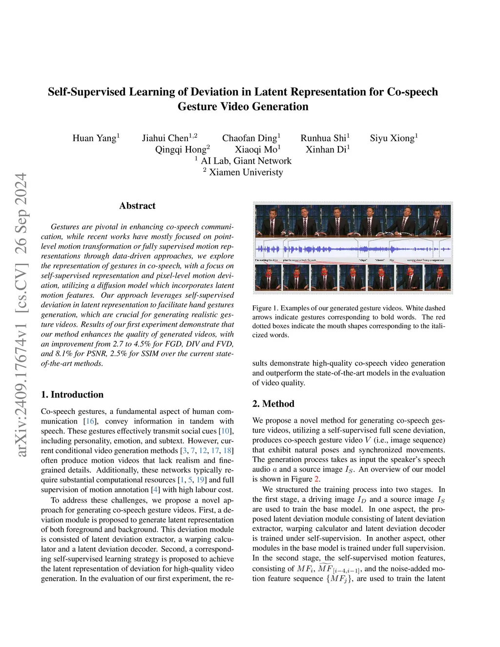 Gestures are pivotal in enhancing co-speech communication. While recent works have mostly focused on point-level motion transformation or fully supervised motion representations through data-driven approaches, we explore the representation of gestures in co-speech, with a focus on self-supervised representation and pixel-level motion deviation, utilizing a diffusion model which incorporates latent motion features. Our approach leverages self-supervised deviation in latent representation to facilitate hand gestures generation, which are crucial for generating realistic gesture videos. Results of our first experiment demonstrate that our method enhances the quality of generated videos, with an improvement from 2.7 to 4.5% for FGD, DIV, and FVD, and 8.1% for PSNR, 2.5% for SSIM over the current state-of-the-art methods.