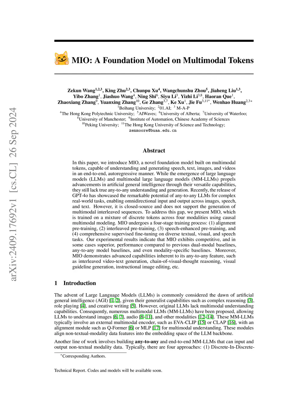 In this paper, we introduce MIO, a novel foundation model built on multimodal tokens, capable of understanding and generating speech, text, images, and videos in an end-to-end, autoregressive manner. While the emergence of large language models (LLMs) and multimodal large language models (MM-LLMs) propels advancements in artificial general intelligence through their versatile capabilities, they still lack true any-to-any understanding and generation. Recently, the release of GPT-4o has showcased the remarkable potential of any-to-any LLMs for complex real-world tasks, enabling omnidirectional input and output across images, speech, and text. However, it is closed-source and does not support the generation of multimodal interleaved sequences. To address this gap, we present MIO, which is trained on a mixture of discrete tokens across four modalities using causal multimodal modeling. MIO undergoes a four-stage training process: (1) alignment pre-training, (2) interleaved pre-training, (3) speech-enhanced pre-training, and (4) comprehensive supervised fine-tuning on diverse textual, visual, and speech tasks. Our experimental results indicate that MIO exhibits competitive, and in some cases superior, performance compared to previous dual-modal baselines, any-to-any model baselines, and even modality-specific baselines. Moreover, MIO demonstrates advanced capabilities inherent to its any-to-any feature, such as interleaved video-text generation, chain-of-visual-thought reasoning, visual guideline generation, instructional image editing, etc.