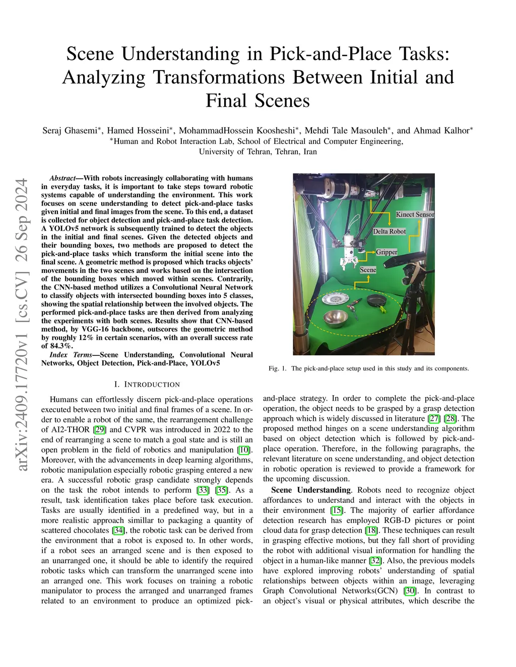 With robots increasingly collaborating with humans in everyday tasks, it is important to take steps toward robotic systems capable of understanding the environment. This work focuses on scene understanding to detect pick and place tasks given initial and final images from the scene. To this end, a dataset is collected for object detection and pick and place task detection. A YOLOv5 network is subsequently trained to detect the objects in the initial and final scenes. Given the detected objects and their bounding boxes, two methods are proposed to detect the pick and place tasks which transform the initial scene into the final scene. A geometric method is proposed which tracks objects' movements in the two scenes and works based on the intersection of the bounding boxes which moved within scenes. Contrarily, the CNN-based method utilizes a Convolutional Neural Network to classify objects with intersected bounding boxes into 5 classes, showing the spatial relationship between the involved objects. The performed pick and place tasks are then derived from analyzing the experiments with both scenes. Results show that the CNN-based method, using a VGG16 backbone, outscores the geometric method by roughly 12 percentage points in certain scenarios, with an overall success rate of 84.3%.
