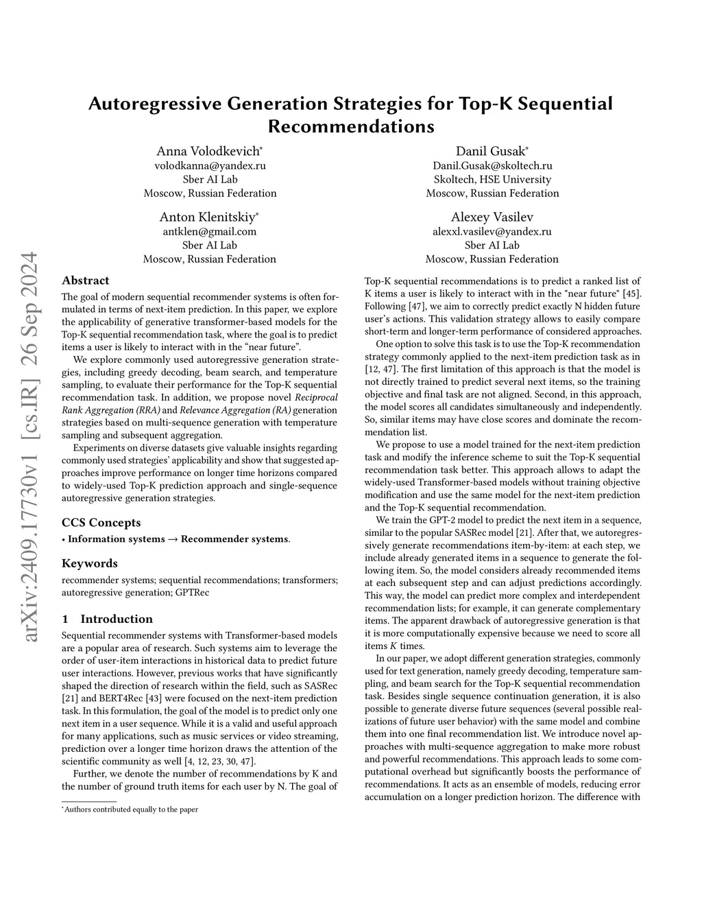 The goal of modern sequential recommender systems is often formulated in terms of next-item prediction. In this paper, we explore the applicability of generative transformer-based models for the Top-K sequential recommendation task, where the goal is to predict items a user is likely to interact with in the "near future". We explore commonly used autoregressive generation strategies, including greedy decoding, beam search, and temperature sampling, to evaluate their performance for the Top-K sequential recommendation task. In addition, we propose novel Reciprocal Rank Aggregation (RRA) and Relevance Aggregation (RA) generation strategies based on multi-sequence generation with temperature sampling and subsequent aggregation. Experiments on diverse datasets give valuable insights regarding commonly used strategies' applicability and show that suggested approaches improve performance on longer time horizons compared to widely-used Top-K prediction approach and single-sequence autoregressive generation strategies.