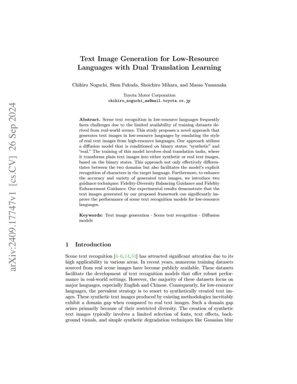Scene text recognition in low-resource languages frequently faces challenges due to the limited availability of training datasets derived from real-world scenes. This study proposes a novel approach that generates text images in low-resource languages by emulating the style of real text images from high-resource languages. Our approach utilizes a diffusion model that is conditioned on binary states: ``synthetic'' and ``real.'' The training of this model involves dual translation tasks, where it transforms plain text images into either synthetic or real text images, based on the binary states. This approach not only effectively differentiates between the two domains but also facilitates the model's explicit recognition of characters in the target language. Furthermore, to enhance the accuracy and variety of generated text images, we introduce two guidance techniques: Fidelity-Diversity Balancing Guidance and Fidelity Enhancement Guidance. Our experimental results demonstrate that the text images generated by our proposed framework can significantly improve the performance of scene text recognition models for low-resource languages.