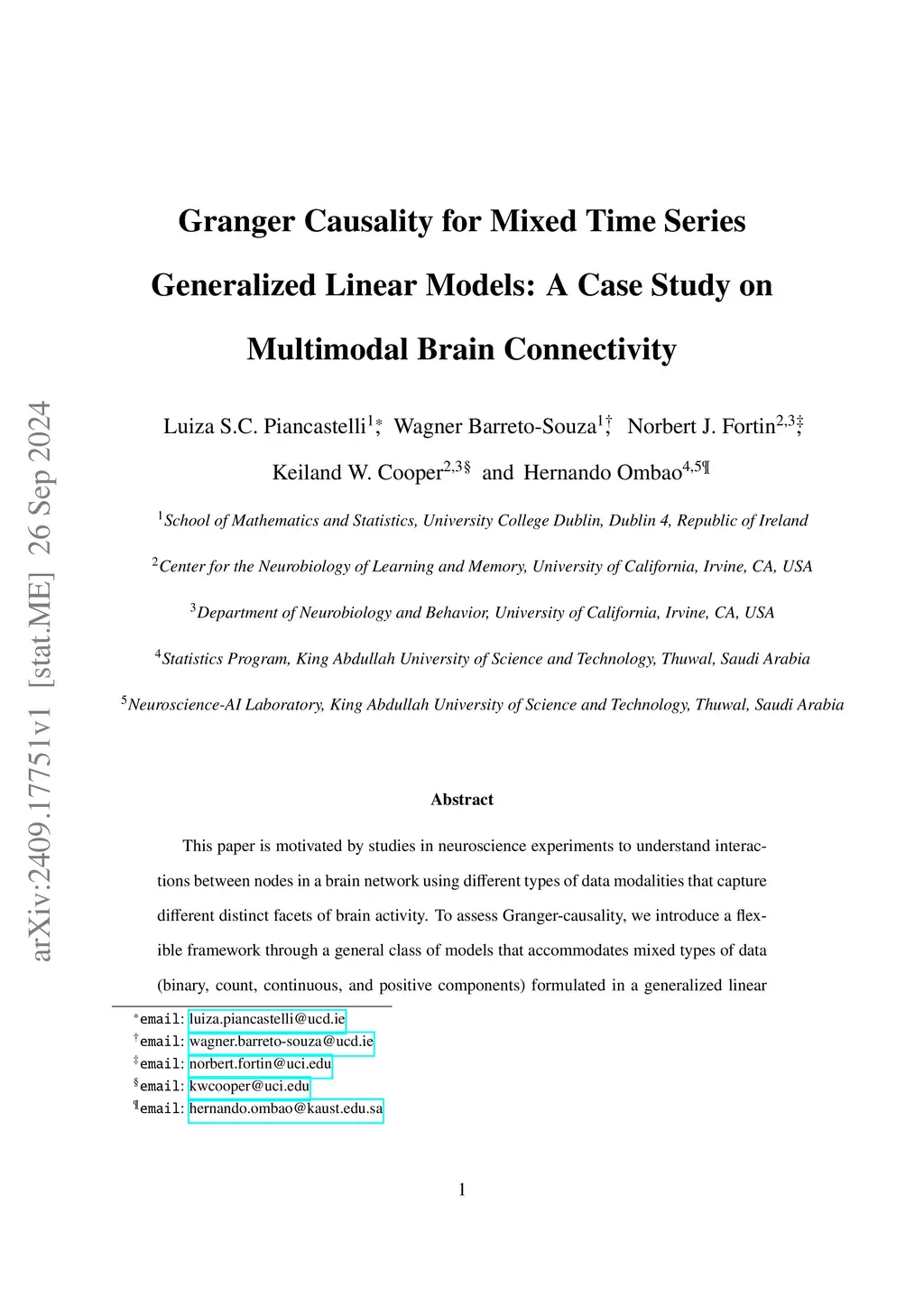 This paper is motivated by studies in neuroscience experiments to understand interactions between nodes in a brain network using different types of data modalities that capture different distinct facets of brain activity. To assess Granger-causality, we introduce a flexible framework through a general class of models that accommodates mixed types of data (binary, count, continuous, and positive components) formulated in a generalized linear model (GLM) fashion. Statistical inference for causality is performed based on both frequentist and Bayesian approaches, with a focus on the latter. Here, we develop a procedure for conducting inference through the proposed Bayesian mixed time series model. By introducing spike and slab priors for some parameters in the model, our inferential approach guides causality order selection and provides proper uncertainty quantification. The proposed methods are then utilized to study the rat spike train and local field potentials (LFP) data recorded during the olfaction working memory task. The proposed methodology provides critical insights into the causal relationship between the rat spiking activity and LFP spectral power. Specifically, power in the LFP beta band is predictive of spiking activity 300 milliseconds later, providing a novel analytical tool for this area of emerging interest in neuroscience and demonstrating its usefulness and flexibility in the study of causality in general.