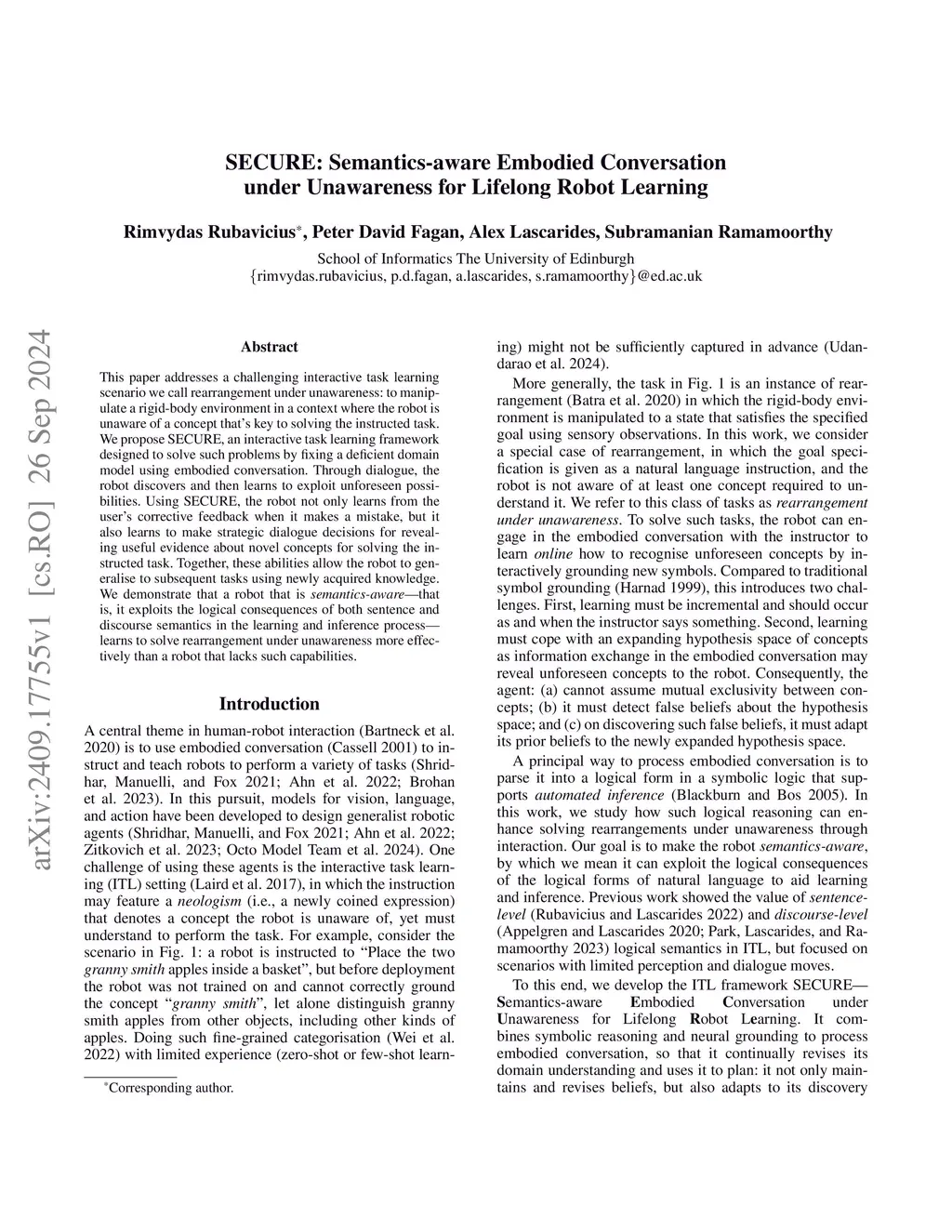 This paper addresses a challenging interactive task learning scenario we call rearrangement under unawareness: an agent must manipulate a rigid-body environment without knowing a key concept necessary for solving the task and must learn about it during deployment. For example, the user may ask to "put the two granny smith apples inside the basket", but the agent cannot correctly identify which objects in the environment are "granny smith" as the agent has not been exposed to such a concept before. We introduce SECURE, an interactive task learning policy designed to tackle such scenarios. The unique feature of SECURE is its ability to enable agents to engage in semantic analysis when processing embodied conversations and making decisions. Through embodied conversation, a SECURE agent adjusts its deficient domain model by engaging in dialogue to identify and learn about previously unforeseen possibilities. The SECURE agent learns from the user's embodied corrective feedback when mistakes are made and strategically engages in dialogue to uncover useful information about novel concepts relevant to the task. These capabilities enable the SECURE agent to generalize to new tasks with the acquired knowledge. We demonstrate in the simulated Blocksworld and the real-world apple manipulation environments that the SECURE agent, which solves such rearrangements under unawareness, is more data-efficient than agents that do not engage in embodied conversation or semantic analysis.