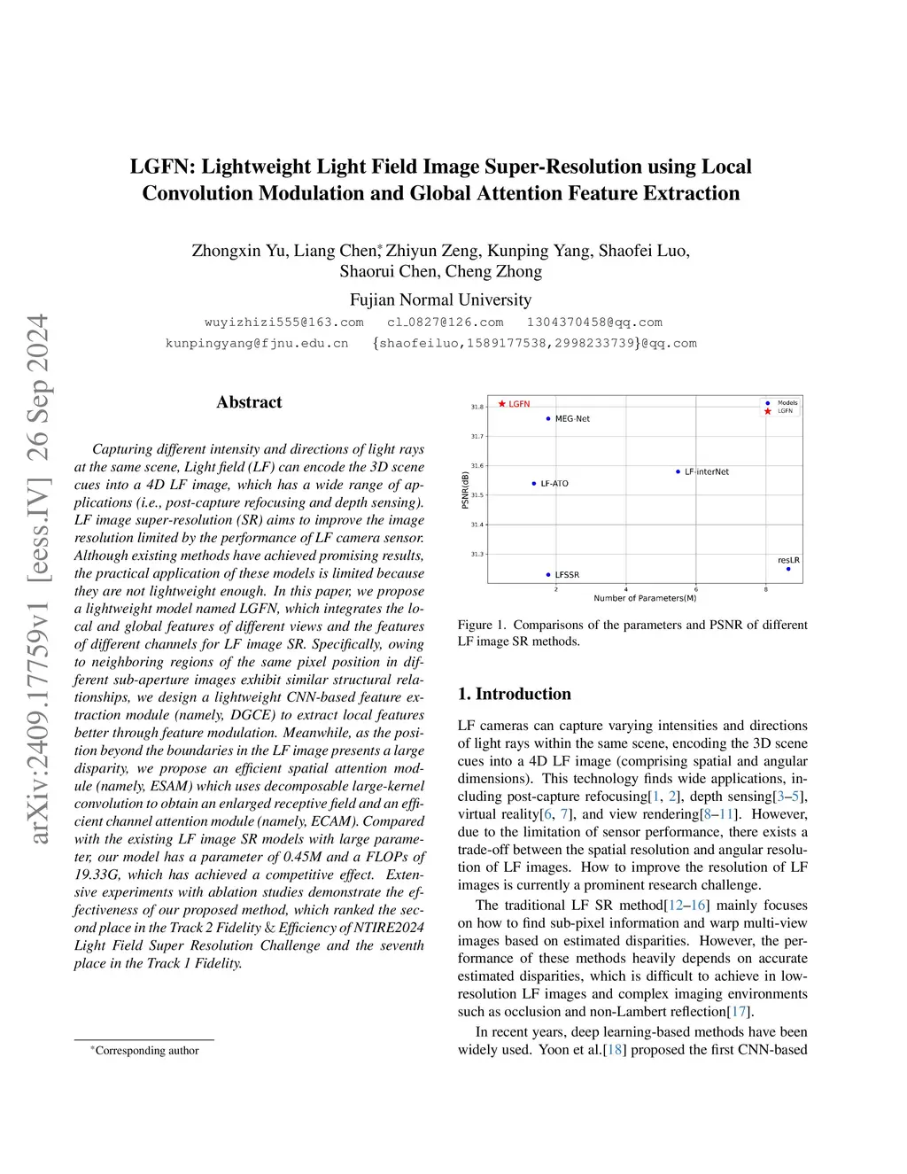 Capturing different intensity and directions of light rays at the same scene Light field (LF) can encode the 3D scene cues into a 4D LF image which has a wide range of applications (i.e. post-capture refocusing and depth sensing). LF image super-resolution (SR) aims to improve the image resolution limited by the performance of LF camera sensor. Although existing methods have achieved promising results the practical application of these models is limited because they are not lightweight enough. In this paper we propose a lightweight model named LGFN which integrates the local and global features of different views and the features of different channels for LF image SR. Specifically owing to neighboring regions of the same pixel position in different sub-aperture images exhibit similar structural relationships we design a lightweight CNN-based feature extraction module (namely DGCE) to extract local features better through feature modulation. Meanwhile as the position beyond the boundaries in the LF image presents a large disparity we propose an efficient spatial attention module (namely ESAM) which uses decomposable large-kernel convolution to obtain an enlarged receptive field and an efficient channel attention module (namely ECAM). Compared with the existing LF image SR models with large parameter our model has a parameter of 0.45M and a FLOPs of 19.33G which has achieved a competitive effect. Extensive experiments with ablation studies demonstrate the effectiveness of our proposed method which ranked the second place in the Track 2 Fidelity & Efficiency of NTIRE2024 Light Field Super Resolution Challenge and the seventh place in the Track 1 Fidelity.
