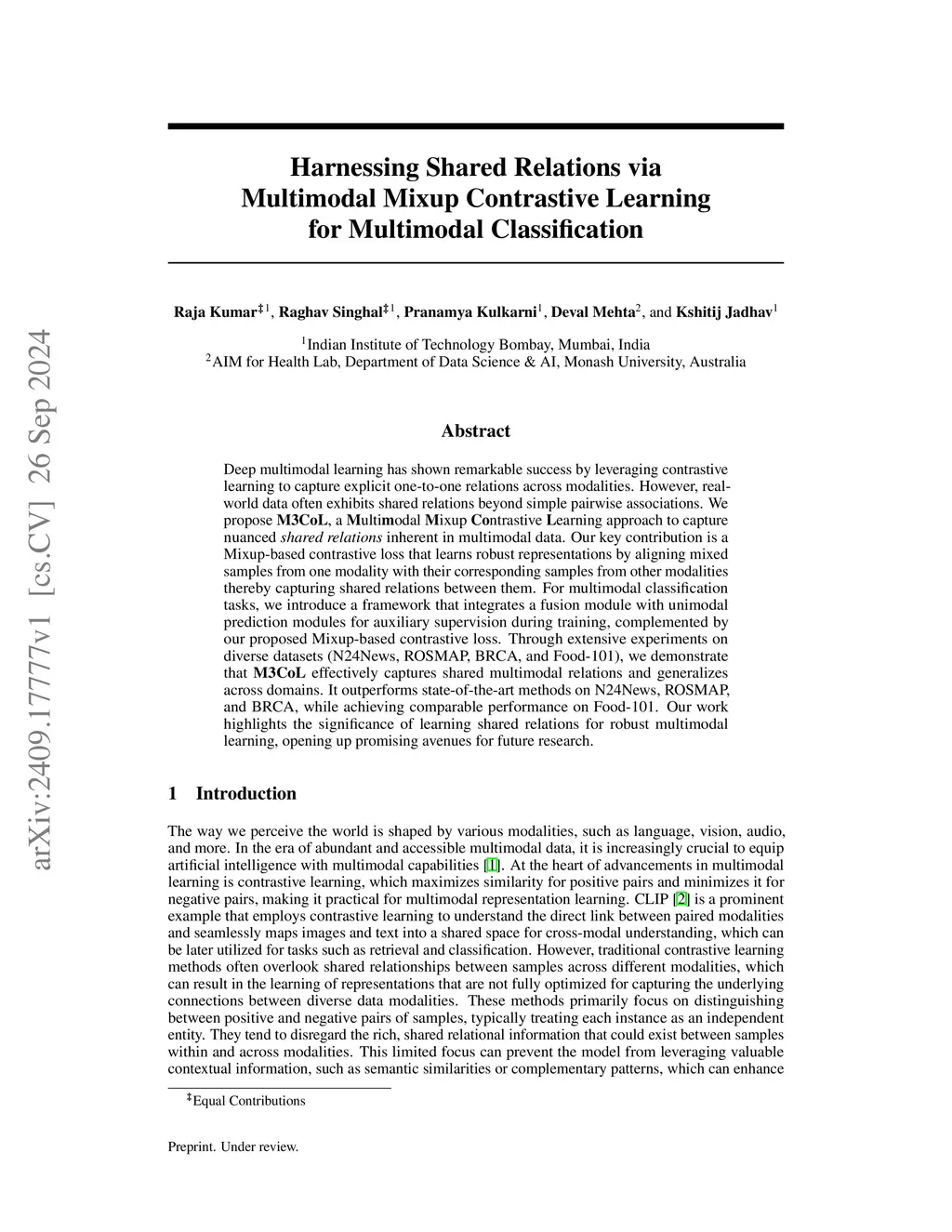 Harnessing Shared Relations via Multimodal Mixup Contrastive Learning for Multimodal Classification