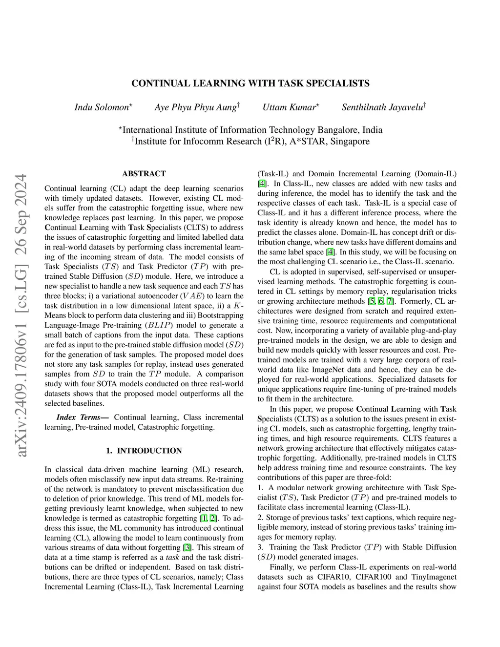 Continual learning (CL) enables models to adapt to evolving data streams without catastrophic forgetting, a fundamental requirement for real-world AI systems. However, the current methods often depend on large replay buffers or heavily annotated datasets which are impractical due to storage, privacy, and cost constraints. We propose CLTS (Continual Learning via Text-Image Synergy), a novel class-incremental framework that mitigates forgetting without storing real task data. CLTS leverages pre-trained vision-language models, BLIP (Bootstrapping Language-Image Pre-training) for caption generation and stable diffusion for sample generation. Each task is handled by a dedicated Task Head, while a Task Router learns to assign inputs to the correct Task Head using the generated data. On three benchmark datasets, CLTS improves average task accuracy by up to 54% and achieves 63 times better memory efficiency compared to four recent continual learning baselines, demonstrating improved retention and adaptability. CLTS introduces a novel perspective by integrating generative text-image augmentation for scalable continual learning.