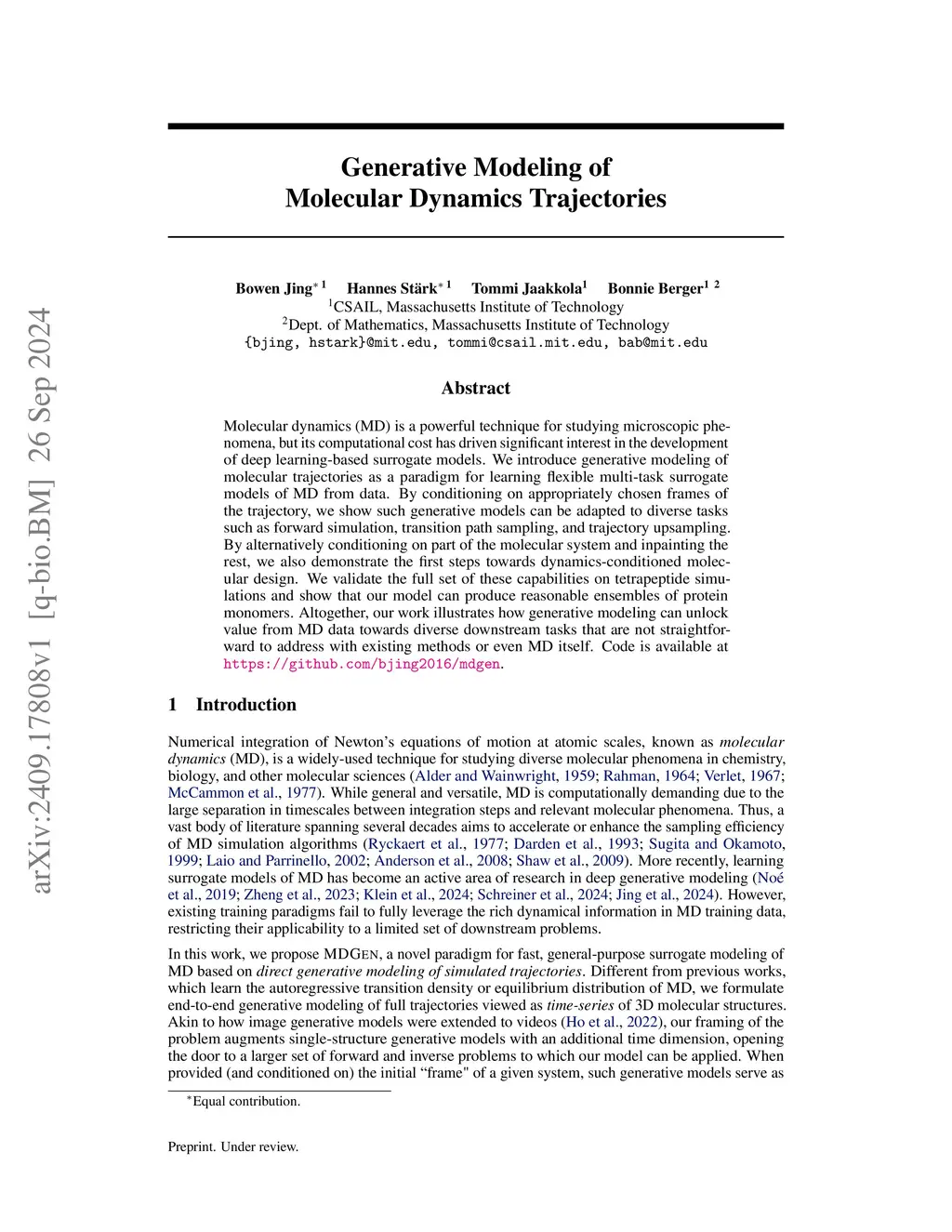 Molecular dynamics (MD) is a powerful technique for studying microscopic phenomena, but its computational cost has driven significant interest in the development of deep learning-based surrogate models. We introduce generative modeling of molecular trajectories as a paradigm for learning flexible multi-task surrogate models of MD from data. By conditioning on appropriately chosen frames of the trajectory, we show such generative models can be adapted to diverse tasks such as forward simulation, transition path sampling, and trajectory upsampling. By alternatively conditioning on part of the molecular system and inpainting the rest, we also demonstrate the first steps towards dynamics-conditioned molecular design. We validate the full set of these capabilities on tetrapeptide simulations and show that our model can produce reasonable ensembles of protein monomers. Altogether, our work illustrates how generative modeling can unlock value from MD data towards diverse downstream tasks that are not straightforward to address with existing methods or even MD itself. Code is available at https://github.com/bjing2016/mdgen.
