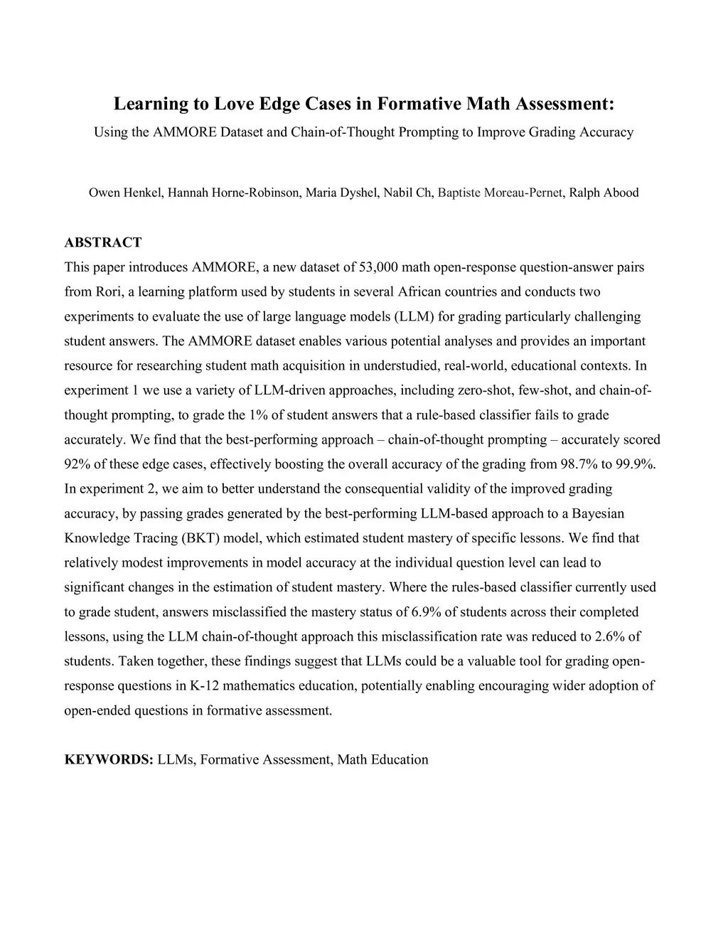 This paper introduces AMMORE, a new dataset of 53,000 math open-response question-answer pairs from Rori, a learning platform used by students in several African countries and conducts two experiments to evaluate the use of large language models (LLM) for grading particularly challenging student answers. The AMMORE dataset enables various potential analyses and provides an important resource for researching student math acquisition in understudied, real-world, educational contexts. In experiment 1 we use a variety of LLM-driven approaches, including zero-shot, few-shot, and chain-of-thought prompting, to grade the 1% of student answers that a rule-based classifier fails to grade accurately. We find that the best-performing approach -- chain-of-thought prompting -- accurately scored 92% of these edge cases, effectively boosting the overall accuracy of the grading from 98.7% to 99.9%. In experiment 2, we aim to better understand the consequential validity of the improved grading accuracy, by passing grades generated by the best-performing LLM-based approach to a Bayesian Knowledge Tracing (BKT) model, which estimated student mastery of specific lessons. We find that relatively modest improvements in model accuracy at the individual question level can lead to significant changes in the estimation of student mastery. Where the rules-based classifier currently used to grade student, answers misclassified the mastery status of 6.9% of students across their completed lessons, using the LLM chain-of-thought approach this misclassification rate was reduced to 2.6% of students. Taken together, these findings suggest that LLMs could be a valuable tool for grading open-response questions in K-12 mathematics education, potentially enabling encouraging wider adoption of open-ended questions in formative assessment.