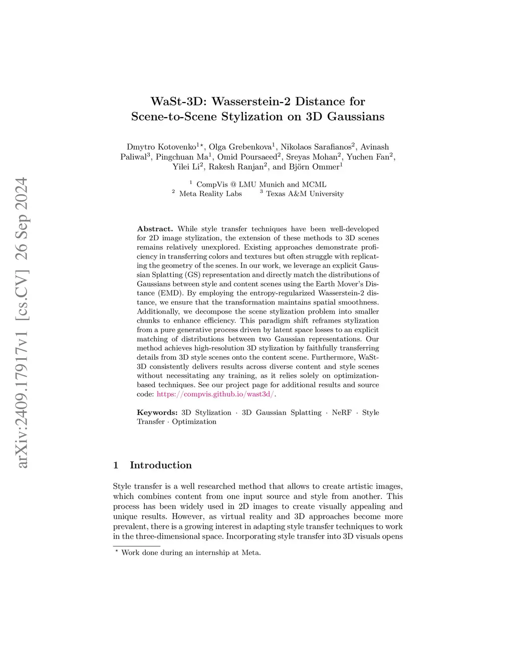WaSt-3D: Wasserstein-2 Distance for Scene-to-Scene Stylization on 3D