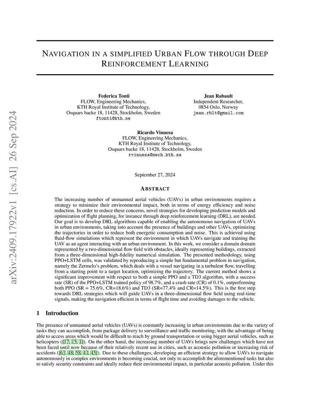 The increasing number of unmanned aerial vehicles (UAVs) in urban environments requires a strategy to minimize their environmental impact, both in terms of energy efficiency and noise reduction. In order to reduce these concerns, novel strategies for developing prediction models and optimization of flight planning, for instance through deep reinforcement learning (DRL), are needed. Our goal is to develop DRL algorithms capable of enabling the autonomous navigation of UAVs in urban environments, taking into account the presence of buildings and other UAVs, optimizing the trajectories in order to reduce both energetic consumption and noise. This is achieved using fluid-flow simulations which represent the environment in which UAVs navigate and training the UAV as an agent interacting with an urban environment. In this work, we consider a domain domain represented by a two-dimensional flow field with obstacles, ideally representing buildings, extracted from a three-dimensional high-fidelity numerical simulation. The presented methodology, using PPO+LSTM cells, was validated by reproducing a simple but fundamental problem in navigation, namely the Zermelo's problem, which deals with a vessel navigating in a turbulent flow, travelling from a starting point to a target location, optimizing the trajectory. The current method shows a significant improvement with respect to both a simple PPO and a TD3 algorithm, with a success rate (SR) of the PPO+LSTM trained policy of 98.7%, and a crash rate (CR) of 0.1%, outperforming both PPO (SR = 75.6%, CR=18.6%) and TD3 (SR=77.4% and CR=14.5%). This is the first step towards DRL strategies which will guide UAVs in a three-dimensional flow field using real-time signals, making the navigation efficient in terms of flight time and avoiding damages to the vehicle.