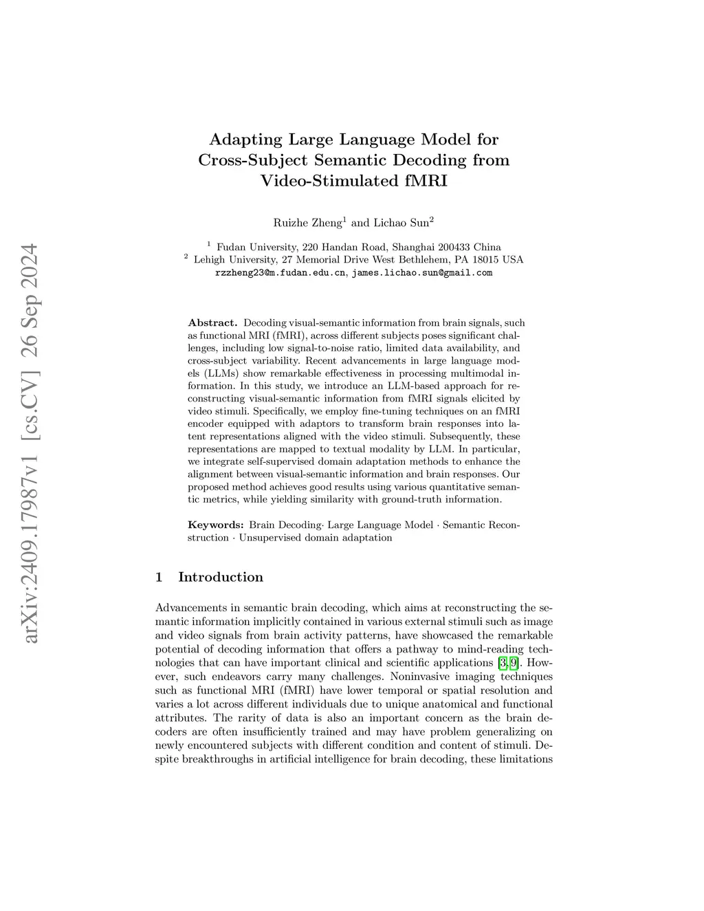 Decoding visual-semantic information from brain signals, such as functional MRI (fMRI), across different subjects poses significant challenges, including low signal-to-noise ratio, limited data availability, and cross-subject variability. Recent advancements in large language models (LLMs) show remarkable effectiveness in processing multimodal information. In this study, we introduce an LLM-based approach for reconstructing visual-semantic information from fMRI signals elicited by video stimuli. Specifically, we employ fine-tuning techniques on an fMRI encoder equipped with adaptors to transform brain responses into latent representations aligned with the video stimuli. Subsequently, these representations are mapped to textual modality by LLM. In particular, we integrate self-supervised domain adaptation methods to enhance the alignment between visual-semantic information and brain responses. Our proposed method achieves good results using various quantitative semantic metrics, while yielding similarity with ground-truth information.