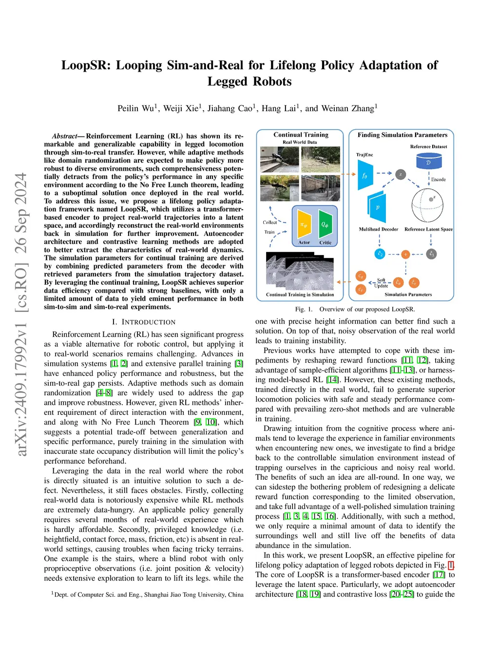 Reinforcement Learning (RL) has shown its remarkable and generalizable capability in legged locomotion through sim-to-real transfer. However, while adaptive methods like domain randomization are expected to enhance policy robustness across diverse environments, they potentially compromise the policy's performance in any specific environment, leading to suboptimal real-world deployment due to the No Free Lunch theorem. To address this, we propose LoopSR, a lifelong policy adaptation framework that continuously refines RL policies in the post-deployment stage. LoopSR employs a transformer-based encoder to map real-world trajectories into a latent space and reconstruct a digital twin of the real world for further improvement. Autoencoder architecture and contrastive learning methods are adopted to enhance feature extraction of real-world dynamics. Simulation parameters for continual training are derived by combining predicted values from the decoder with retrieved parameters from a pre-collected simulation trajectory dataset. By leveraging simulated continual training, LoopSR achieves superior data efficiency compared with strong baselines, yielding eminent performance with limited data in both sim-to-sim and sim-to-real experiments. Please refer tothis https URLfor videos and code.