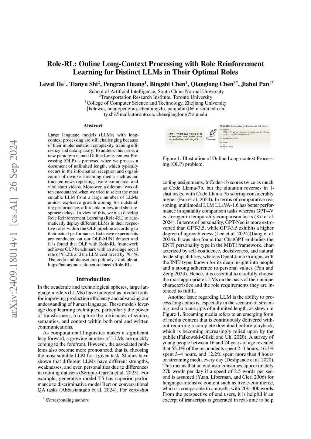 Large language models (LLMs) with long-context processing are still challenging because of their implementation complexity, training efficiency and data sparsity. To address this issue, a new paradigm named Online Long-context Processing (OLP) is proposed when we process a document of unlimited length, which typically occurs in the information reception and organization of diverse streaming media such as automated news reporting, live e-commerce, and viral short videos. Moreover, a dilemma was often encountered when we tried to select the most suitable LLM from a large number of LLMs amidst explosive growth aiming for outstanding performance, affordable prices, and short response delays. In view of this, we also develop Role Reinforcement Learning (Role-RL) to automatically deploy different LLMs in their respective roles within the OLP pipeline according to their actual performance. Extensive experiments are conducted on our OLP-MINI dataset and it is found that OLP with Role-RL framework achieves OLP benchmark with an average recall rate of 93.2% and the LLM cost saved by 79.4%. The code and dataset are publicly available at: https://anonymous.4open.science/r/Role-RL.