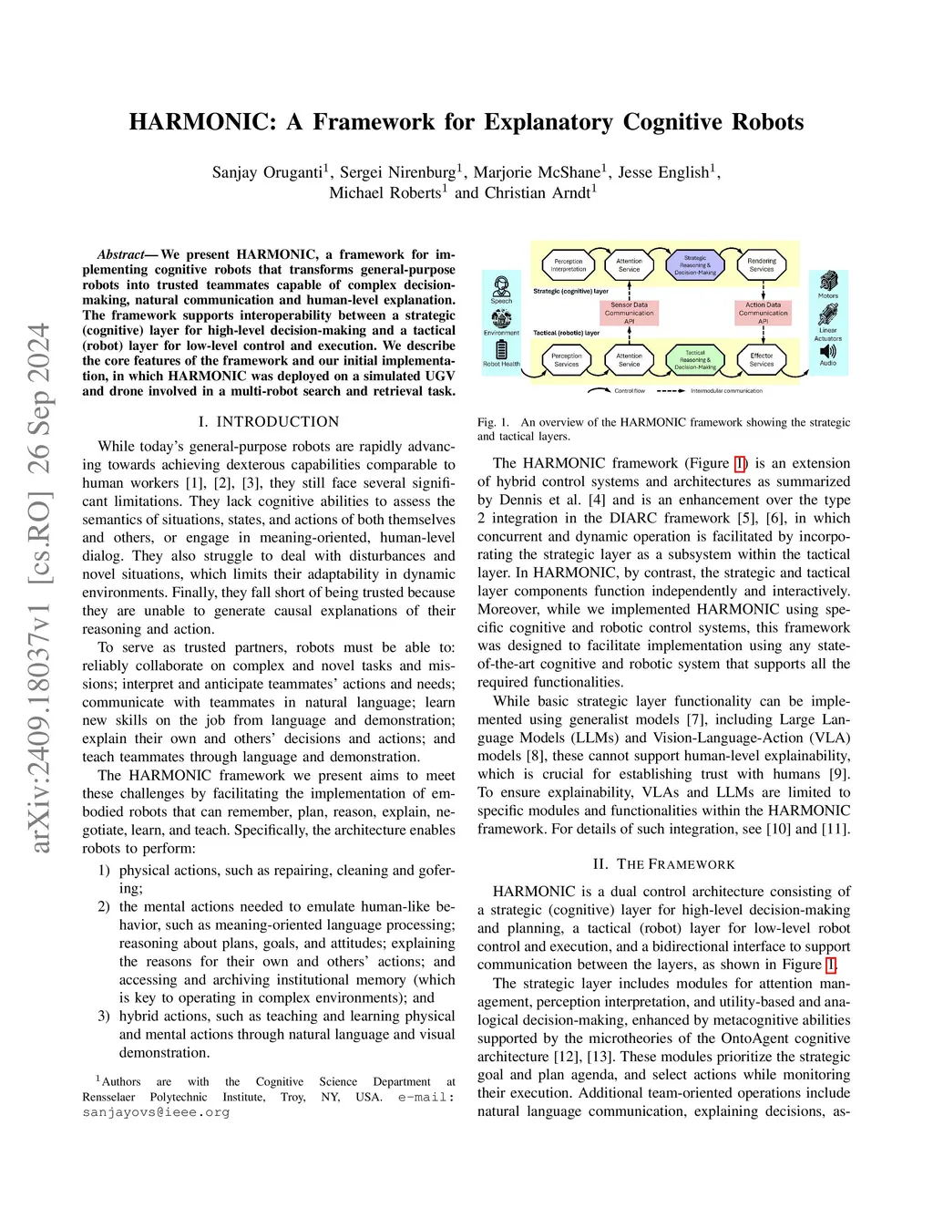 We present HARMONIC, a framework for implementing cognitive robots that transforms general-purpose robots into trusted teammates capable of complex decision-making, natural communication and human-level explanation. The framework supports interoperability between a strategic (cognitive) layer for high-level decision-making and a tactical (robot) layer for low-level control and execution. We describe the core features of the framework and our initial implementation, in which HARMONIC was deployed on a simulated UGV and drone involved in a multi-robot search and retrieval task.