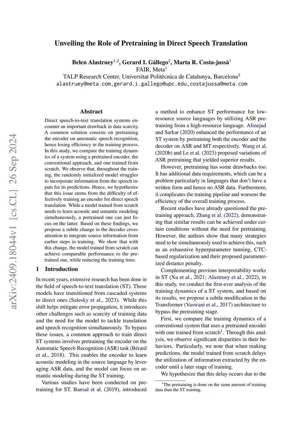 Direct speech-to-text translation systems encounter an important drawback in data scarcity. A common solution consists on pretraining the encoder on automatic speech recognition, hence losing efficiency in the training process. In this study, we compare the training dynamics of a system using a pretrained encoder, the conventional approach, and one trained from scratch. We observe that, throughout the training, the randomly initialized model struggles to incorporate information from the speech inputs for its predictions. Hence, we hypothesize that this issue stems from the difficulty of effectively training an encoder for direct speech translation. While a model trained from scratch needs to learn acoustic and semantic modeling simultaneously, a pretrained one can just focus on the latter. Based on these findings, we propose a subtle change in the decoder cross-attention to integrate source information from earlier steps in training. We show that with this change, the model trained from scratch can achieve comparable performance to the pretrained one, while reducing the training time.