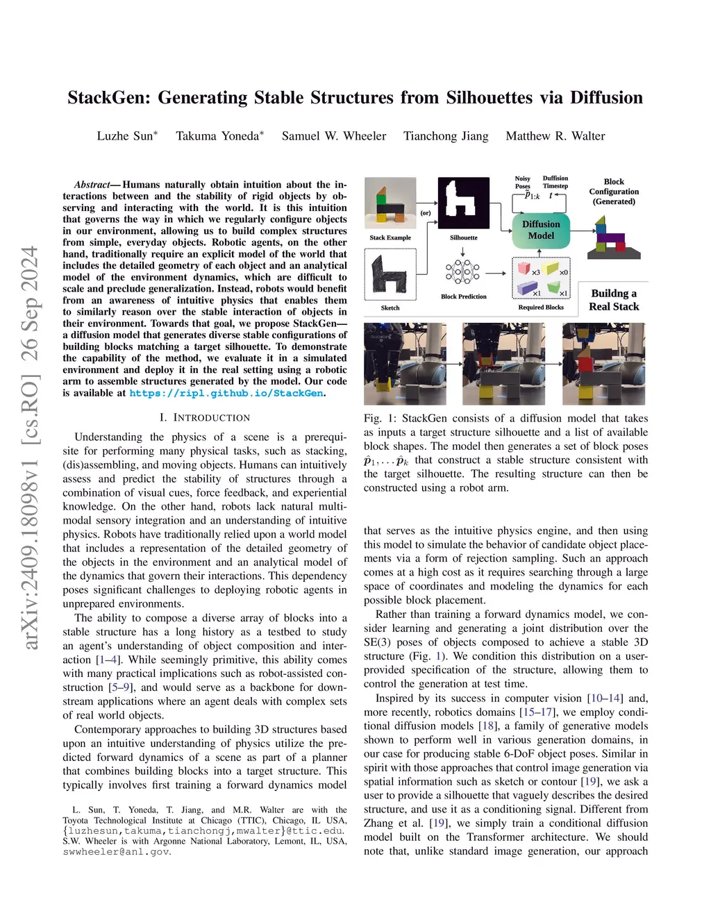 Humans naturally obtain intuition about the interactions between and the stability of rigid objects by observing and interacting with the world. It is this intuition that governs the way in which we regularly configure objects in our environment, allowing us to build complex structures from simple, everyday objects. Robotic agents, on the other hand, traditionally require an explicit model of the world that includes the detailed geometry of each object and an analytical model of the environment dynamics, which are difficult to scale and preclude generalization. Instead, robots would benefit from an awareness of intuitive physics that enables them to similarly reason over the stable interaction of objects in their environment. Towards that goal, we propose StackGen, a diffusion model that generates diverse stable configurations of building blocks matching a target silhouette. To demonstrate the capability of the method, we evaluate it in a simulated environment and deploy it in the real setting using a robotic arm to assemble structures generated by the model.
