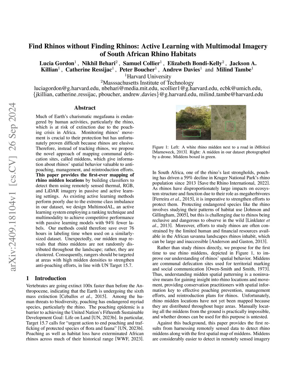 Much of Earth's charismatic megafauna is endangered by human activities, particularly the rhino, which is at risk of extinction due to the poaching crisis in Africa. Monitoring rhinos' movement is crucial to their protection but has unfortunately proven difficult because rhinos are elusive. Therefore, instead of tracking rhinos, we propose the novel approach of mapping communal defecation sites, called middens, which give information about rhinos' spatial behavior valuable to anti-poaching, management, and reintroduction efforts. This paper provides the first-ever mapping of rhino midden locations by building classifiers to detect them using remotely sensed thermal, RGB, and LiDAR imagery in passive and active learning settings. As existing active learning methods perform poorly due to the extreme class imbalance in our dataset, we design MultimodAL, an active learning system employing a ranking technique and multimodality to achieve competitive performance with passive learning models with 94% fewer labels. Our methods could therefore save over 76 hours in labeling time when used on a similarly-sized dataset. Unexpectedly, our midden map reveals that rhino middens are not randomly distributed throughout the landscape; rather, they are clustered. Consequently, rangers should be targeted at areas with high midden densities to strengthen anti-poaching efforts, in line with UN Target 15.7.