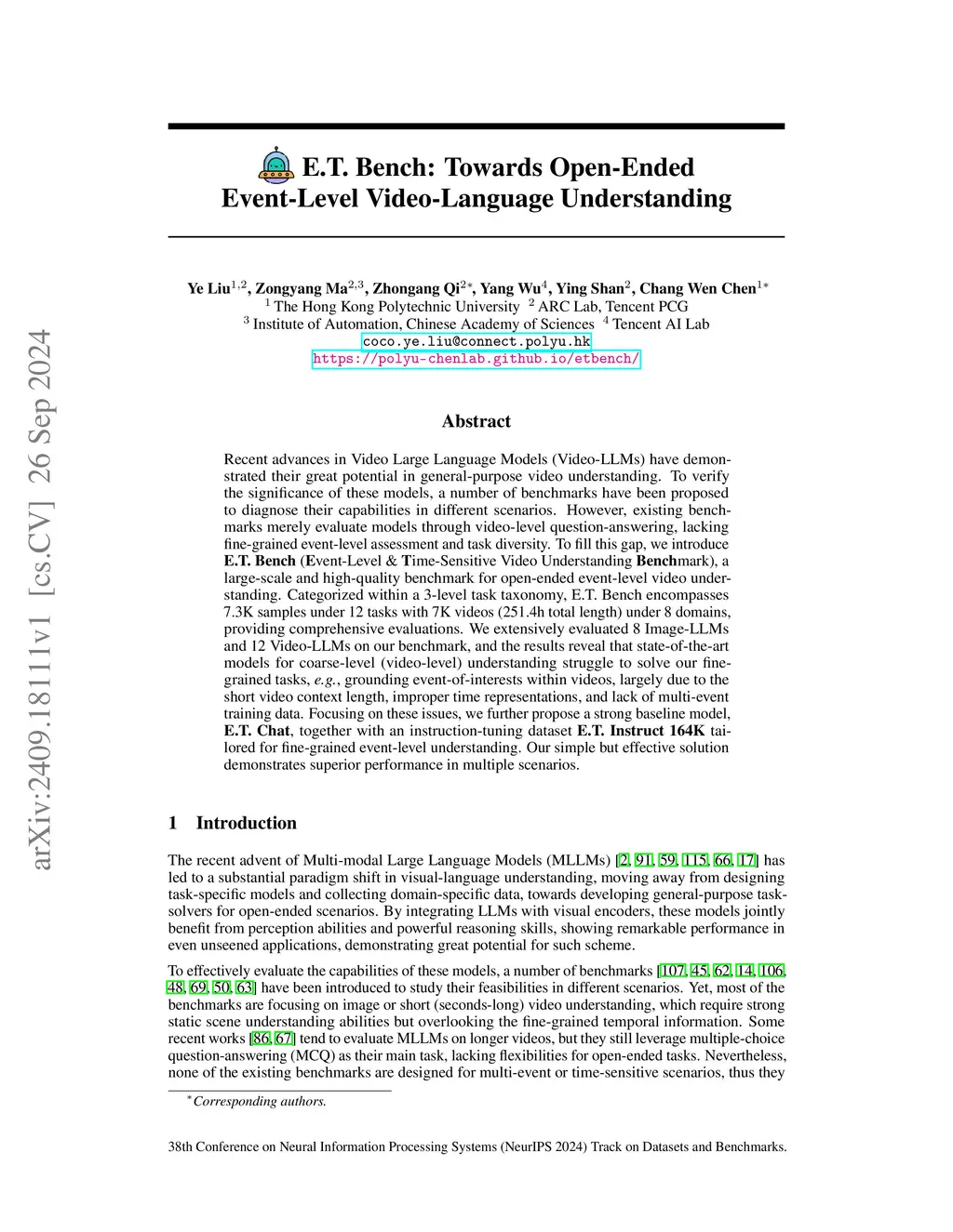 Recent advances in Video Large Language Models (Video-LLMs) have demonstrated their great potential in general-purpose video understanding. To verify the significance of these models, a number of benchmarks have been proposed to diagnose their capabilities in different scenarios. However, existing benchmarks merely evaluate models through video-level question-answering, lacking fine-grained event-level assessment and task diversity. To fill this gap, we introduce E.T. Bench (Event-Level & Time-Sensitive Video Understanding Benchmark), a large-scale and high-quality benchmark for open-ended event-level video understanding. Categorized within a 3-level task taxonomy, E.T. Bench encompasses 7.3K samples under 12 tasks with 7K videos (251.4h total length) under 8 domains, providing comprehensive evaluations. We extensively evaluated 8 Image-LLMs and 12 Video-LLMs on our benchmark, and the results reveal that state-of-the-art models for coarse-level (video-level) understanding struggle to solve our fine-grained tasks, e.g., grounding event-of-interests within videos, largely due to the short video context length, improper time representations, and lack of multi-event training data. Focusing on these issues, we further propose a strong baseline model, E.T. Chat, together with an instruction-tuning dataset E.T. Instruct 164K tailored for fine-grained event-level understanding. Our simple but effective solution demonstrates superior performance in multiple scenarios.