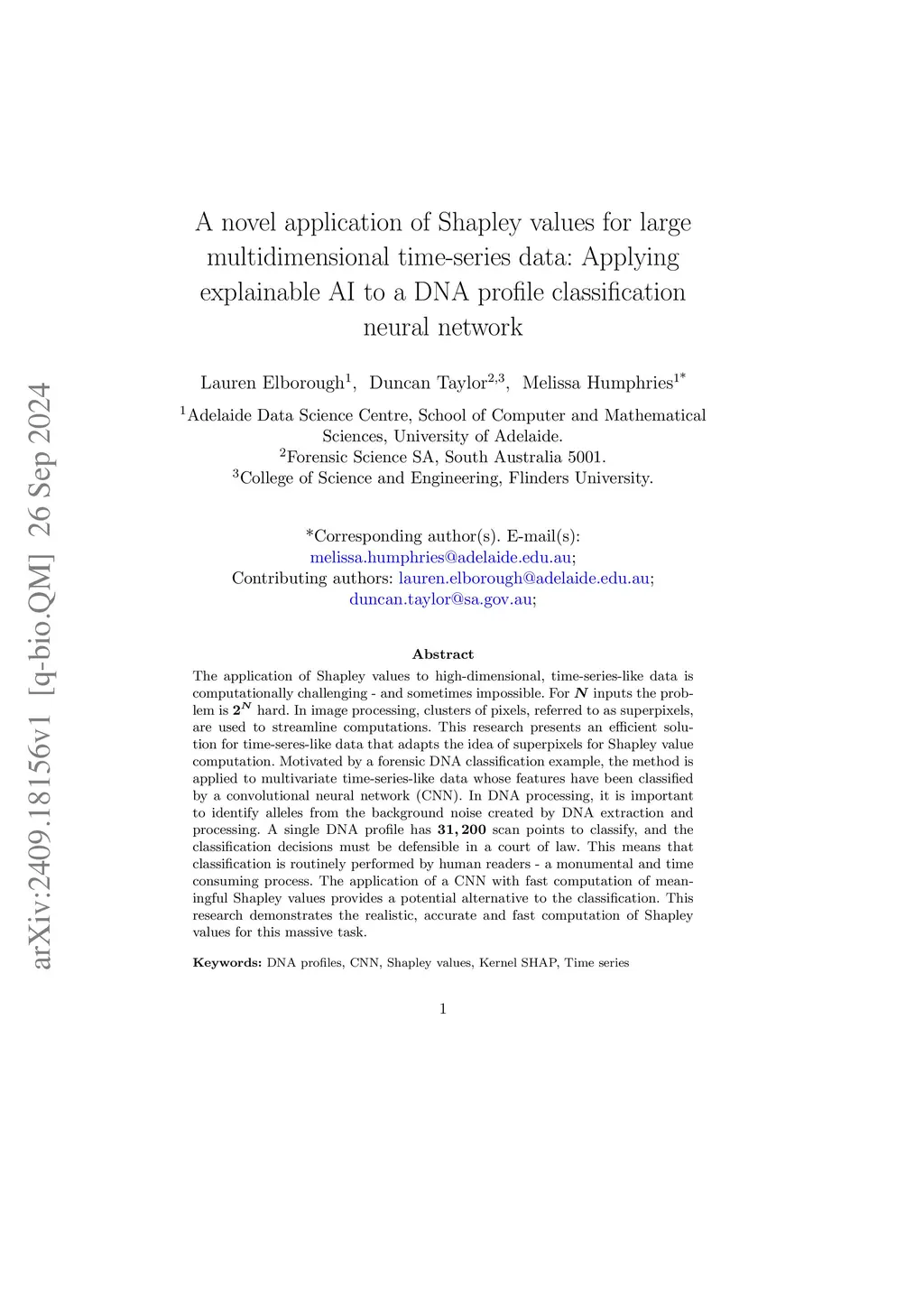The application of Shapley values to high-dimensional, time-series-like data is computationally challenging - and sometimes impossible. For inputs the problem is hard. In image processing, clusters of pixels, referred to as superpixels, are used to streamline computations. This research presents an efficient solution for time-seres-like data that adapts the idea of superpixels for Shapley value computation. Motivated by a forensic DNA classification example, the method is applied to multivariate time-series-like data whose features have been classified by a convolutional neural network (CNN). In DNA processing, it is important to identify alleles from the background noise created by DNA extraction and processing. A single DNA profile has scan points to classify, and the classification decisions must be defensible in a court of law. This means that classification is routinely performed by human readers - a monumental and time consuming process. The application of a CNN with fast computation of meaningful Shapley values provides a potential alternative to the classification. This research demonstrates the realistic, accurate and fast computation of Shapley values for this massive task