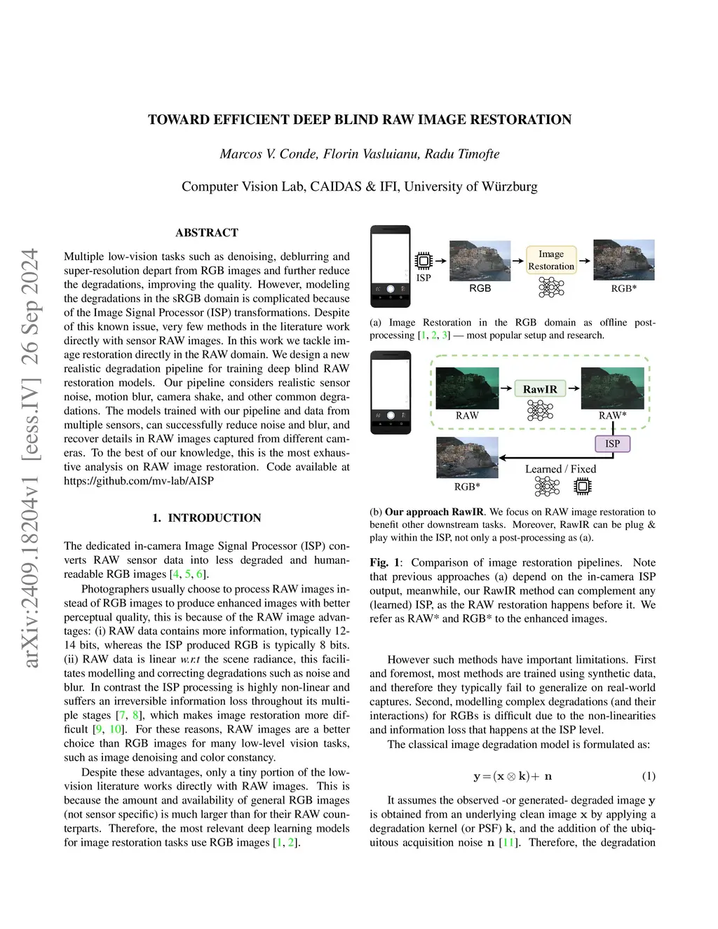 Multiple low-vision tasks such as denoising, deblurring and super-resolution depart from RGB images and further reduce the degradations, improving the quality. However, modeling the degradations in the sRGB domain is complicated because of the Image Signal Processor (ISP) transformations. Despite of this known issue, very few methods in the literature work directly with sensor RAW images. In this work we tackle image restoration directly in the RAW domain. We design a new realistic degradation pipeline for training deep blind RAW restoration models. Our pipeline considers realistic sensor noise, motion blur, camera shake, and other common degradations. The models trained with our pipeline and data from multiple sensors, can successfully reduce noise and blur, and recover details in RAW images captured from different cameras. To the best of our knowledge, this is the most exhaustive analysis on RAW image restoration. Code available at https://github.com/mv-lab/AISP