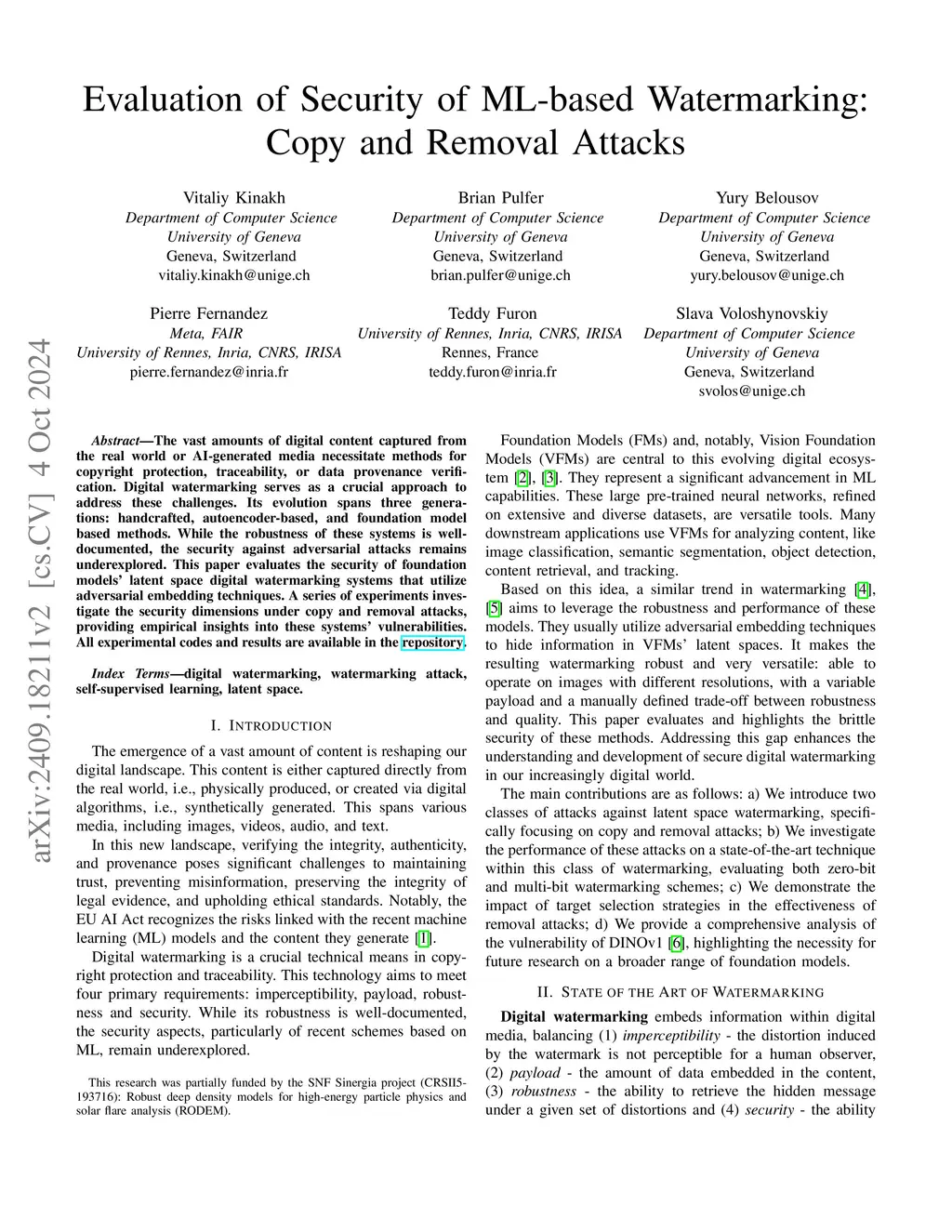 The vast amounts of digital content captured from the real world or AI-generated media necessitate methods for copyright protection, traceability, or data provenance verification. Digital watermarking serves as a crucial approach to address these challenges. Its evolution spans three generations: handcrafted, autoencoder-based, and foundation model based methods. While the robustness of these systems is well-documented, the security against adversarial attacks remains underexplored. This paper evaluates the security of foundation models' latent space digital watermarking systems that utilize adversarial embedding techniques. A series of experiments investigate the security dimensions under copy and removal attacks, providing empirical insights into these systems' vulnerabilities. All experimental codes and results are available at https://github.com/vkinakh/ssl-watermarking-attacks .