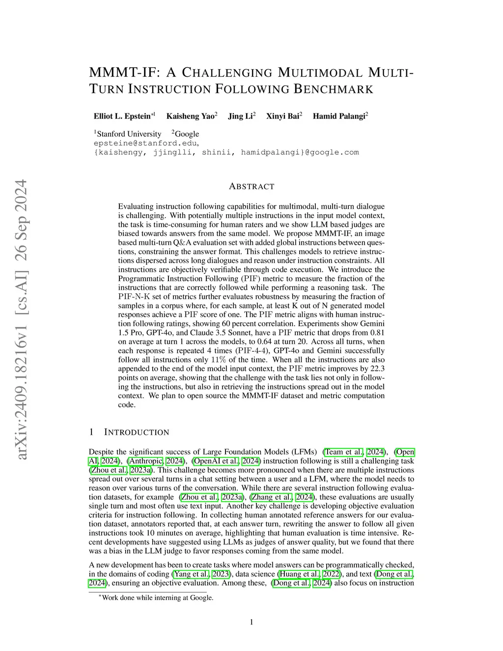 Evaluating instruction following capabilities for multimodal, multi-turn dialogue is challenging. With potentially multiple instructions in the input model context, the task is time-consuming for human raters and we show LLM based judges are biased towards answers from the same model. We propose MMMT-IF, an image based multi-turn QA evaluation set with added global instructions between questions, constraining the answer format. This challenges models to retrieve instructions dispersed across long dialogues and reason under instruction constraints. All instructions are objectively verifiable through code execution. We introduce the Programmatic Instruction Following () metric to measure the fraction of the instructions that are correctly followed while performing a reasoning task. The set of metrics further evaluates robustness by measuring the fraction of samples in a corpus where, for each sample, at least K out of N generated model responses achieve a score of one. The metric aligns with human instruction following ratings, showing 60 percent correlation. Experiments show Gemini 1.5 Pro, GPT-4o, and Claude 3.5 Sonnet, have a metric that drops from 0.81 on average at turn 1 across the models, to 0.64 at turn 20. Across all turns, when each response is repeated 4 times (), GPT-4o and Gemini successfully follow all instructions only of the time. When all the instructions are also appended to the end of the model input context, the metric improves by 22.3 points on average, showing that the challenge with the task lies not only in following the instructions, but also in retrieving the instructions spread out in the model context. We plan to open source the MMMT-IF dataset and metric computation code.