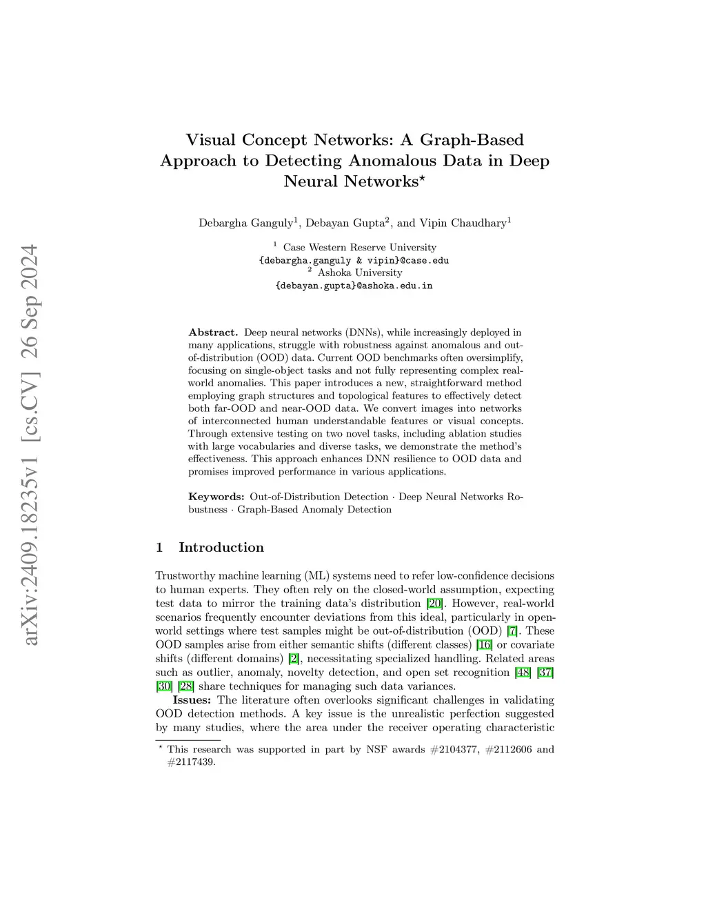 Deep neural networks (DNNs), while increasingly deployed in many applications, struggle with robustness against anomalous and out-of-distribution (OOD) data. Current OOD benchmarks often oversimplify, focusing on single-object tasks and not fully representing complex real-world anomalies. This paper introduces a new, straightforward method employing graph structures and topological features to effectively detect both far-OOD and near-OOD data. We convert images into networks of interconnected human understandable features or visual concepts. Through extensive testing on two novel tasks, including ablation studies with large vocabularies and diverse tasks, we demonstrate the method's effectiveness. This approach enhances DNN resilience to OOD data and promises improved performance in various applications.