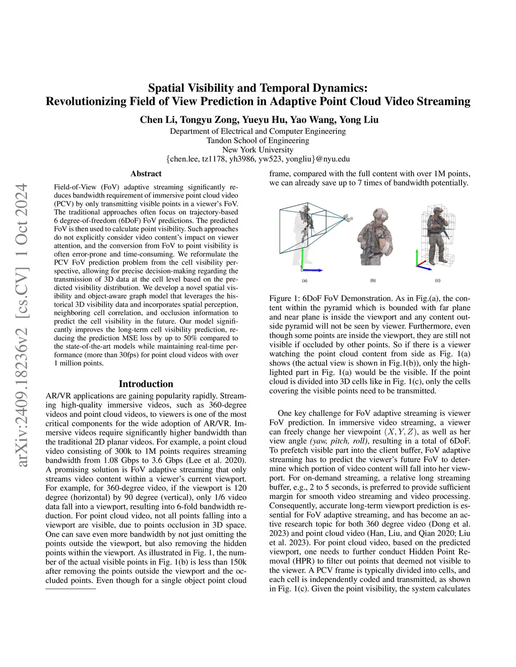 Field-of-View (FoV) adaptive streaming significantly reduces bandwidth requirement of immersive point cloud video (PCV) by only transmitting visible points in a viewer's FoV. The traditional approaches often focus on trajectory-based 6 degree-of-freedom (6DoF) FoV predictions. The predicted FoV is then used to calculate point visibility. Such approaches do not explicitly consider video content's impact on viewer attention, and the conversion from FoV to point visibility is often error-prone and time-consuming. We reformulate the PCV FoV prediction problem from the cell visibility perspective, allowing for precise decision-making regarding the transmission of 3D data at the cell level based on the predicted visibility distribution. We develop a novel spatial visibility and object-aware graph model that leverages the historical 3D visibility data and incorporates spatial perception, neighboring cell correlation, and occlusion information to predict the cell visibility in the future. Our model significantly improves the long-term cell visibility prediction, reducing the prediction MSE loss by up to 50% compared to the state-of-the-art models while maintaining real-time performance (more than 30fps) for point cloud videos with over 1 million points.