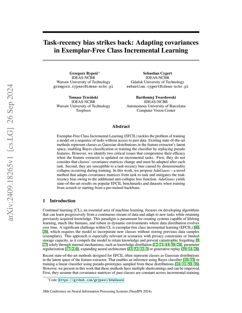 Exemplar-Free Class Incremental Learning (EFCIL) tackles the problem of training a model on a sequence of tasks without access to past data. Existing state-of-the-art methods represent classes as Gaussian distributions in the feature extractor's latent space, enabling Bayes classification or training the classifier by replaying pseudo features. However, we identify two critical issues that compromise their efficacy when the feature extractor is updated on incremental tasks. First, they do not consider that classes' covariance matrices change and must be adapted after each task. Second, they are susceptible to a task-recency bias caused by dimensionality collapse occurring during training. In this work, we propose AdaGauss -- a novel method that adapts covariance matrices from task to task and mitigates the task-recency bias owing to the additional anti-collapse loss function. AdaGauss yields state-of-the-art results on popular EFCIL benchmarks and datasets when training from scratch or starting from a pre-trained backbone. The code is available at: https://github.com/grypesc/AdaGauss.