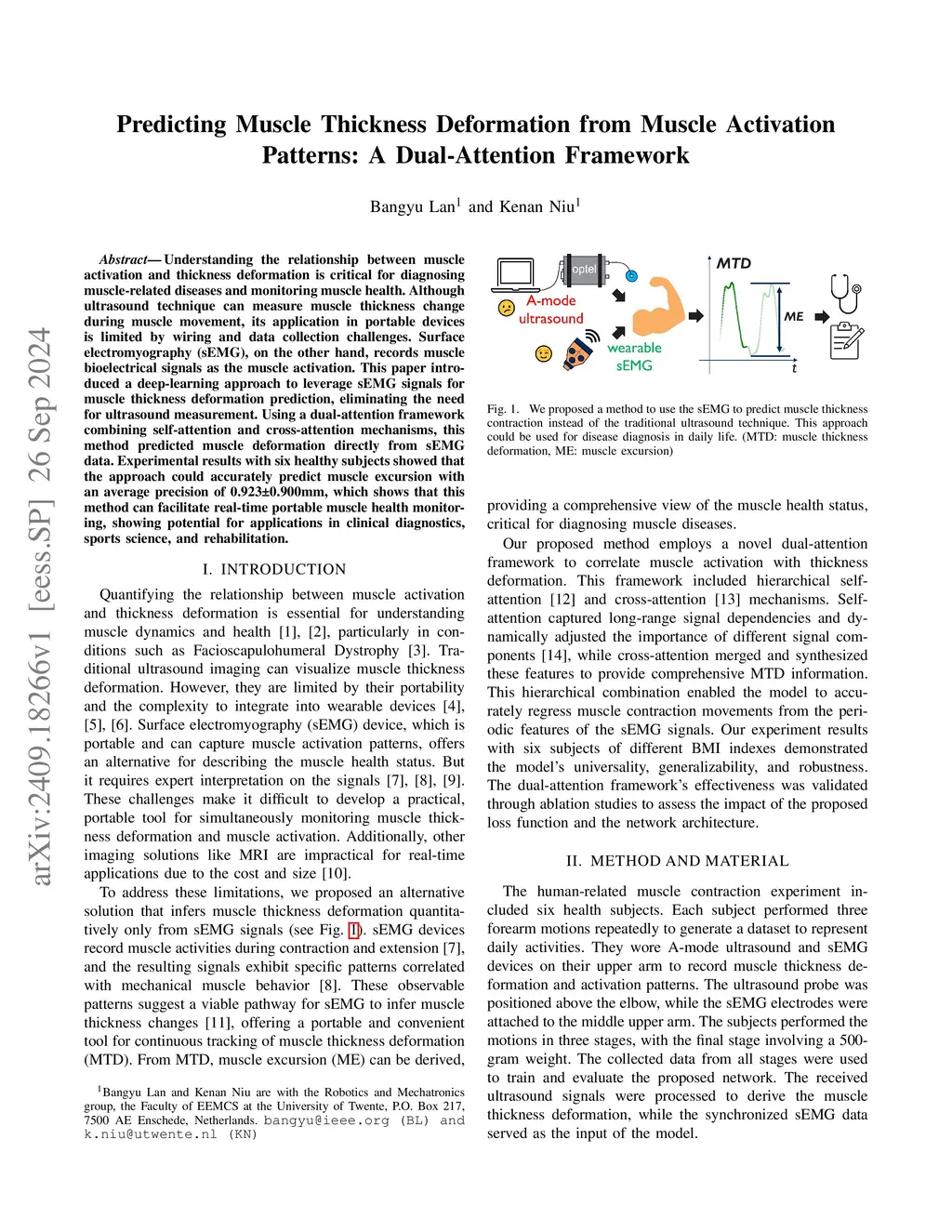 Understanding the relationship between muscle activation and thickness deformation is critical for diagnosing muscle-related diseases and monitoring muscle health. Although ultrasound technique can measure muscle thickness change during muscle movement, its application in portable devices is limited by wiring and data collection challenges. Surface electromyography (sEMG), on the other hand, records muscle bioelectrical signals as the muscle activation. This paper introduced a deep-learning approach to leverage sEMG signals for muscle thickness deformation prediction, eliminating the need for ultrasound measurement. Using a dual-attention framework combining self-attention and cross-attention mechanisms, this method predicted muscle deformation directly from sEMG data. Experimental results with six healthy subjects showed that the approach could accurately predict muscle excursion with an average precision of 0.9230.900mm, which shows that this method can facilitate real-time portable muscle health monitoring, showing potential for applications in clinical diagnostics, sports science, and rehabilitation.