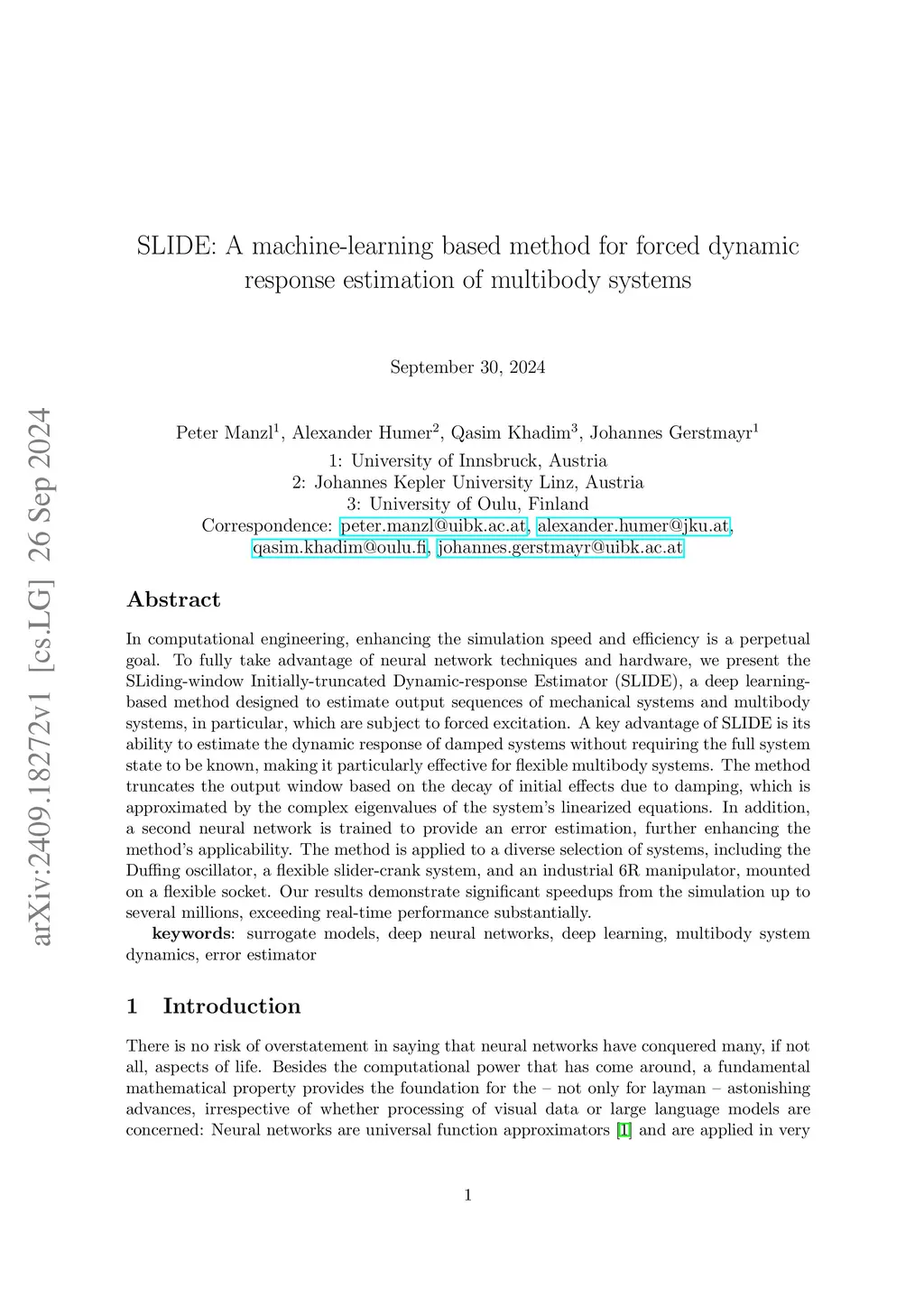 In computational engineering, enhancing the simulation speed and efficiency is a perpetual goal. To fully take advantage of neural network techniques and hardware, we present the SLiding-window Initially-truncated Dynamic-response Estimator (SLIDE), a deep learning-based method designed to estimate output sequences of mechanical or multibody systems with primarily, but not exclusively, forced excitation. A key advantage of SLIDE is its ability to estimate the dynamic response of damped systems without requiring the full system state, making it particularly effective for flexible multibody systems. The method truncates the output window based on the decay of initial effects, such as damping, which is approximated by the complex eigenvalues of the systems linearized equations. In addition, a second neural network is trained to provide an error estimation, further enhancing the methods applicability. The method is applied to a diverse selection of systems, including the Duffing oscillator, a flexible slider-crank system, and an industrial 6R manipulator, mounted on a flexible socket. Our results demonstrate significant speedups from the simulation up to several millions, exceeding real-time performance substantially.