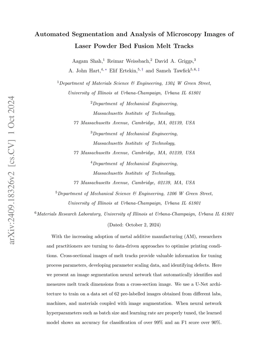 With the increasing adoption of metal additive manufacturing (AM), researchers and practitioners are turning to data-driven approaches to optimise printing conditions. Cross-sectional images of melt tracks provide valuable information for tuning process parameters, developing parameter scaling data, and identifying defects. Here we present an image segmentation neural network that automatically identifies and measures melt track dimensions from a cross-section image. We use a U-Net architecture to train on a data set of 62 pre-labelled images obtained from different labs, machines, and materials coupled with image augmentation. When neural network hyperparameters such as batch size and learning rate are properly tuned, the learned model shows an accuracy for classification of over 99% and an F1 score over 90%. The neural network exhibits robustness when tested on images captured by various users, printed on different machines, and acquired using different microscopes. A post-processing module extracts the height and width of the melt pool, and the wetting angles. We discuss opportunities to improve model performance and avenues for transfer learning, such as extension to other AM processes such as directed energy deposition.