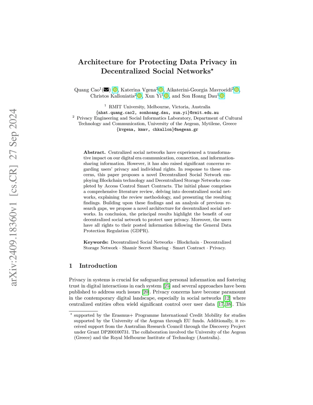 Centralized social networks have experienced a transformative impact on our digital era communication, connection, and information-sharing information. However, it has also raised significant concerns regarding users' privacy and individual rights. In response to these concerns, this paper proposes a novel Decentralized Social Network employing Blockchain technology and Decentralized Storage Networks completed by Access Control Smart Contracts. The initial phase comprises a comprehensive literature review, delving into decentralized social networks, explaining the review methodology, and presenting the resulting findings. Building upon these findings and an analysis of previous research gaps, we propose a novel architecture for decentralized social networks. In conclusion, the principal results highlight the benefit of our decentralized social network to protect user privacy. Moreover, the users have all rights to their posted information following the General Data Protection Regulation (GDPR).