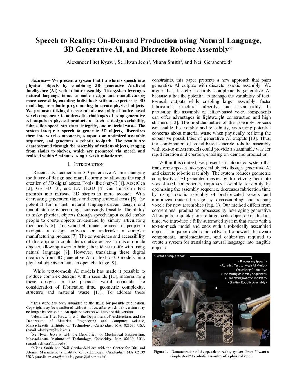 We present a system that transforms speech into physical objects using 3D generative AI and discrete robotic assembly. By leveraging natural language input, the system makes design and manufacturing more accessible to individuals without expertise in 3D modeling or robotic programming. While current generative AI models can produce a wide range of 3D digital assets, AI-generated meshes are not directly suitable for robotic fabrication and do not account for fabrication constraints. To address this, we contribute a workflow that integrates natural language processing, 3D generative AI, and discrete robotic assembly. The system automatically analyzes and modifies AI-generated geometry to meet physical constraints, such as component count, overhangs, and connectivity, and produces a feasible robotic assembly sequence and toolpath. The results are demonstrated through the assembly of various objects, ranging from chairs to shelves, which are prompted via speech and realized within 5 minutes using a robotic arm.